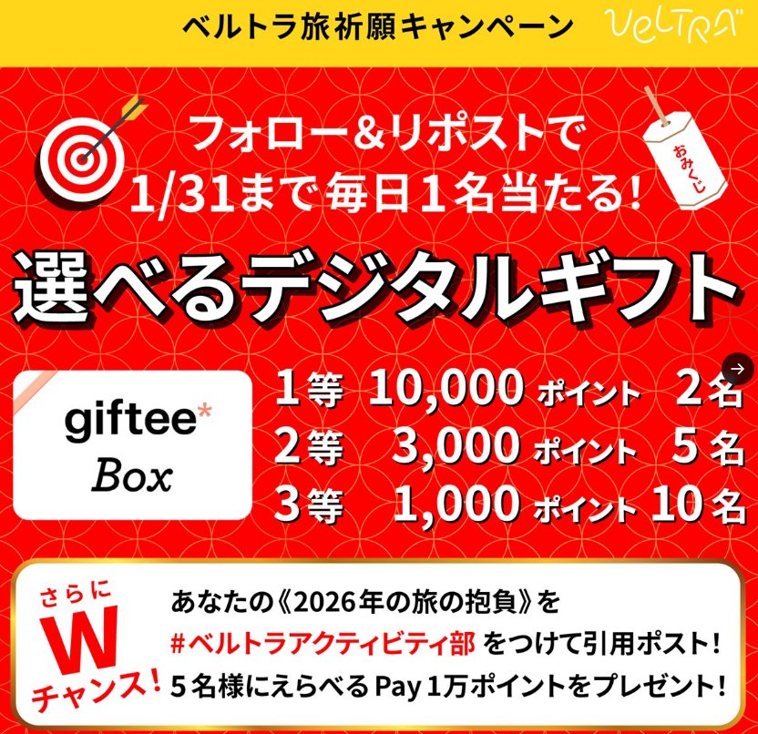 懸賞情報最大1万円分のgiftee Boxが毎日1名様に当たるXキャンペーン 懸賞名:ベルトラ旅祈願キャンペーン当選賞品:giftee Box 最大1万円分当選人数:毎日1名様応募条件:X(Twitter)アカウントで毎日応募企業名:VELTRA この懸賞に応募する2026年01月31日(残り16日) 見逃せない懸賞純金 海老天 / ホワイトホース卓上ホットショーケース / あっとギフト 500円分1名様 / 5名様 / 2,020名様4K液晶テレビ / バルミューダ 空気清浄機 / Dyson 掃除機 他50名様 / 50名様 / 50名様 他豪華賞品(月替り)賞品によって異なります電子マネー 1,000円分1,000名様釣りグミBIGぬいぐるみ5,500名様気になっていたあの商品をお得に試せるサイト「サンプル百貨店」 応募可能な懸賞関連する当選報告 人気の育児グッズやテーマパークチケットなどが当たる豪華ママ・プレママさん向けキャンペーン!残り43日えらべるPay1,000円分が1,000名様に当たる森永のレシートキャンペーン残り15日【近商ストア×はごろもフーズ】宝塚歌劇S席ペアご招待キャンペーン残り16日菌活レトルトセットやきのこセットも当たるホクトのクローズドキャンペーン2026年03月31日(全3回開催)毎月応募もアリ☆THERMOS製品が当たる会員限定キャンペーン!随時開催5,000円分のQUOカードPayがもらえるタカラレーベンの来場キャンペーン残り17日 メットライフ生命保険「HUG YOUR SMILE キャンペーン」P&G「PANTENE トリコン・アンバサダーセット」が当選しました♪キリンの懸賞で「TAMIYA ミニ四駆セット」が当選しました☆明治のクローズド懸賞で「オリゴスマートセット」が当選しました!ヤマナカ・UCCのハガキ懸賞で当選!「ランチブッフェ&コーヒー教室」へ行ってきました♪花王のハガキ懸賞で「ダッフィー&シェリーメイのぬいぐるみ + 食卓クイックスプレー」が当選しました♪ 関連情報: X懸賞(Twitter懸賞)オープン懸賞毎日応募ネット懸賞現金・金券・ギフト券豪華・高額懸賞SNS懸賞懸賞情報 高額賞品・高級品ギフトコード|デジタルギフト HOME懸賞情報応募方法SNS懸賞X懸賞(Twitter懸賞)最大1万円分のgiftee Boxが毎日1名様に当たるXキャンペーン 2026年01月15日 更新:ものりんず@懸賞主婦【厳選】毎日応募 【全て】毎日応募 年末年始懸賞
