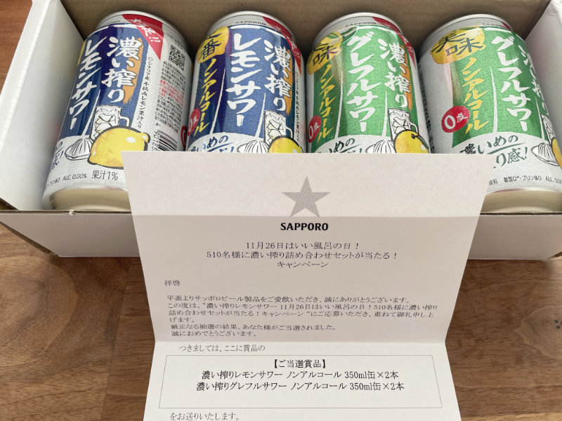 サッポロビールのX懸賞で「濃い搾りレモンサワー・グレフルサワーノンアルコールセット」が当選しました!
