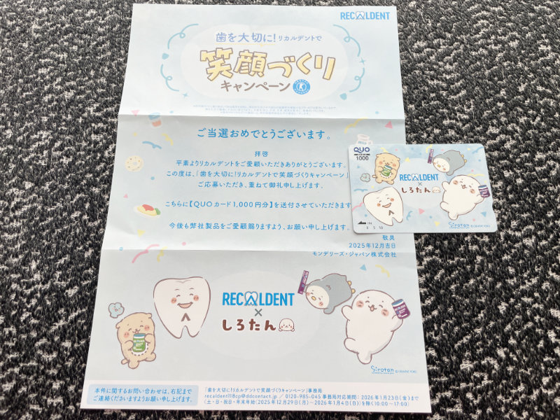 こちらはこの懸賞ブログでも紹介しました、モンデリーズ・ジャパンの「【リカルデント×しろたん】 歯を大切に!リカルデントで笑顔づくりキャンペーン」で当選した賞品です♪