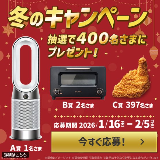 懸賞情報Dysonの空気清浄ファンヒーターやBALMUDAトースターも当たる豪華LINE懸賞 懸賞名:冬のキャンペーン当選賞品&当選人数:A賞:Dyson 空気清浄ファンヒーター(1名様)B賞:BALMUDA ザ・トースター プロ(2名様)C賞:モスチキン引換クーポン(397名様)応募条件:LINEアカウントで応募企業名:明治安田生命 この懸賞に応募する2026年02月05日(残り18日) 見逃せない懸賞ムーミン オリジナルグッズ / e-GIFT 500円分各回200名様 / 各回300名様電子マネー 1,000円分1,000名様Disneyのおしりふき毎月1名様旅行券 10万円分 / プライドポテト 1年分 / 湖池屋商品 40袋3名様 / 150名様 / 1,110名様サンドラッグ専用QUOカードPay 最大1万円分1,100名様ベルメゾンのおすすめ商品(毎週変動)賞品によって異なります 応募可能な懸賞関連する当選報告 毎月開催!AGF商品が当たる会員限定プレゼントキャンペーン毎月開催毎月「Oh!Baby」シリーズアイテムが当たるクイズ懸賞♪毎月開催【現在妊娠中のかた向け】はじめてのベビースタイがもらえる会員登録キャンペーン♪締切日不明総額100万円相当の賞品が当たるLINEMOの豪華キャンペーン残り21日キンレイ商品やデジタルギフトが当たる大量当選レシート懸賞残り102日ブランケットや歯ブラシセットなども当たるビーンスタークのレシート懸賞2026年02月28日(毎月末日) 湖池屋のキャンペーンで「湖池屋プライドポテト詰め合わせ」が当選しました!エスビー食品「濃いシチューシリーズ4種類セット」が当選しました!Suntory「フォレスティ 森のソーダ”森の香りを体験!”キャンペーン」アピタ・ピアゴ&理研のハガキ懸賞で「商品券 2,000円分」が当選しました♪フィニッシュ「やさしくて強いママ応援キャンペーン」が当選しました☆日本製紙クレシアのクローズド懸賞で「クリネックス商品セット」が当選しました! 関連情報: オープン懸賞LINE懸賞ネット懸賞家電・デジタル機器豪華・高額懸賞無料クーポン・引換券SNS懸賞懸賞情報 高額賞品・高級品暖房器具クーポン・無料券生活家電調理家電加湿器・除湿機・清浄機オーブン・レンジ・トースター明治安田生命dyson|ダイソンBALMUDA|バルミューダ HOME懸賞情報応募方法SNS懸賞LINE懸賞Dysonの空気清浄ファンヒーターやBALMUDAトースターも当たる豪華LINE懸賞 2026年01月16日 更新:ものりんず@懸賞主婦【厳選】毎日応募 【全て】毎日応募 年末年始懸賞