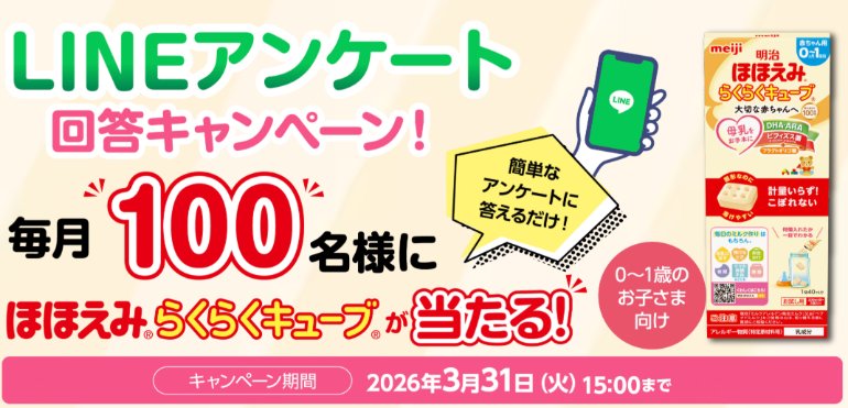 懸賞情報毎月100名様にらくらくキューブが当たる明治のLINEキャンペーン 懸賞名:明治ほほえみ らくらくキューブ LINEアンケート回答キャンペーン当選賞品:ほほえみ らくらくキューブ当選人数:毎月100名様応募条件:LINEアカウントで応募企業名:明治 この懸賞に応募する2026年03月31日 15時00分(残り73日) 見逃せない懸賞Amazonギフトカード 2,000円分2,000名様プリキュアグッズ合計9,000名様気になっていたあの商品をお得に試せるサイト「サンプル百貨店」ユニクロ商品モニター合計2,000名様楽天ポイント 200ポイント1,500名様JTB カタログギフト1名様 応募可能な懸賞関連する当選報告 毎月50名様にQUOカードが当たる会員限定キャンペーン♪毎月開催毎日100名様にえらべるPay500円分がその場で当たるXキャンペーン残り4日ディズニーシー“スパークリング・ジュビリー”スペシャルナイト招待券が当たる豪華懸賞残り28日-196無糖<ダブルレモン>シリーズの無料引換クーポンがその場で当たるキャンペーン残り34日Wチャンスもアリ!20,000円分のギフトカードが当たるクローズドキャンペーン毎月末日1,500名様に素敵なアイテムが当たるサクマいちごみるく55周年キャンペーン2026年03月31日(全3回抽選) 岡三食品のハガキ懸賞で「むき栗アソートセット」が当選しましたネスカフェのキャンペーンで「ネスカフェ ゴールドブレンド バリスタセット」が当選しました!伊藤園「TULLY’S COFFEE 本物のこだわりプレゼントキャンペーン」DCMホールディングス&呉工業のハガキ懸賞で「JCBギフトカード 5,000円分」が当選しました!日清冷凍食品のネットクローズド懸賞で「Amazonギフト券10,000円分」が当選しました!フィール×伊藤ハムのクローズド懸賞で「伊藤ハム商品詰め合わせ」が当選しました! 関連情報: 育児・子育て懸賞オープン懸賞LINE懸賞ネット懸賞SNS懸賞ベビー・キッズ・おもちゃ懸賞情報毎月・毎週・定期懸賞 ミルク育児・子育てmeiji|明治 HOME懸賞情報応募方法SNS懸賞LINE懸賞毎月100名様にらくらくキューブが当たる明治のLINEキャンペーン 2026年01月16日 更新:ものりんず@懸賞主婦【厳選】毎日応募 【全て】毎日応募 年末年始懸賞