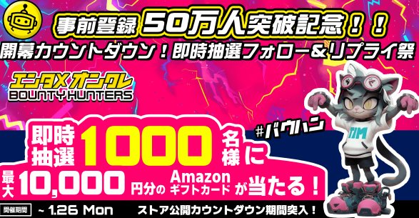 懸賞情報その場で当たる最大1万円のAmazonギフトがその場で1,000名様に当たるX懸賞 懸賞名:フォロー&リポスト祭当選賞品:Amazonギフト 最大1万円分当選人数:1,000名様応募条件:X(Twitter)アカウントでその場で当たる企業名:バウンティハンターズ - 推しとシンクロ × オンクレバトル この懸賞に応募する2026年01月26日(残り6日) 見逃せない懸賞Coke ONドリンクチケット / Adoコラボ 珈琲専科ペアマグ / 「わたしに花束」ぬいぐるみBIG20万名様 / 5,000名様 / 100名様-196無糖<ダブルレモン>無料引換クーポン29万名様こどもちゃれんじ資料&年齢別体験セット応募者全員ディズニー プライベート・イブニング・パーティー招待券 他各回合計1,000組2,500名様 他QUOカードPay 1,000円分1,000名様サイベックス ミオス ベビーカー / 洗えるベビー布団セット / パナソニック 電動自転車 他1名様 / 3名様 / 1名様 他 応募可能な懸賞関連する当選報告 ハウステンボス1DAYパス付きホテル宿泊券も当たるユースキン製薬の豪華懸賞2026年03月31日(全4回開催)500円分のAmazonギフトカードが826名様にその場で当たるXキャンペーン(本日最終日!!)勝利の女神:NIKKE × ZONe ENERGYコラボのオリジナルアクスタやQUOカード当たるキャンペーン残り11日映画『楓』ムビチケやオリジナルグッズが当たるキャンペーン2026年01月31日(賞品によって異なります)『映画ドラえもん 新・のび太の海底鬼岩城』ムビチケ前売券が当たる毎日応募Xキャンペーン締切日不明毎月抽選!エリス コンパクトガードがお試しできるキャンペーン!毎月末日 東海ラジオ・キンレイのハガキ懸賞で「キンレイ詰め合わせ」が当選しました♪竹田の塩辛フェアーで北海道産「ななつぼし」が当選しました♪ツルハ×P&Gのクローズド懸賞で「P&G商品セット」が当選しました!ポチカム「リニューアルしたエースコック ベトナム仕込みの本格“米めん” 」が当選!キッコーマンのフォトコンテストで「商品詰め合わせ」が当選しました♪Pigeonのフォトコンテストで「ピジョン製品詰め合わせ」が当選♪ 関連情報: X懸賞(Twitter懸賞)オープン懸賞ネット懸賞その場で当たる豪華・高額懸賞現金・金券・ギフト券大量当選SNS懸賞懸賞情報 高額賞品・高級品Amazonギフト券 HOME懸賞情報応募方法SNS懸賞X懸賞(Twitter懸賞)最大1万円のAmazonギフトがその場で1,000名様に当たるX懸賞 2026年01月20日 更新:ものりんず@懸賞主婦【厳選】毎日応募 【全て】毎日応募 年末年始懸賞