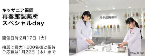 懸賞情報再春館製薬所スペシャルday inキッザニア福岡の招待券が当たる豪華懸賞 懸賞名:「再春館製薬所スペシャルday inキッザニア福岡」抽選で最大500組1,000名様をご招待いたします当選賞品:再春館製薬所スペシャルday inキッザニア福岡チケット当選人数:最大500組1,000名様応募条件:アンケートに答えて応募企業名:再春館製薬所 この懸賞に応募する2026年01月22日(残り2日) 見逃せない懸賞サントリー セサミンEX 商品モニター1万名様Coke ONドリンクチケット / PayPayポイント 500ポイント 他100,000名様 / 10,000名様 / 50名様 他Disneyのおしりふき毎月1名様ユニクロ商品モニター合計2,000名様BRUNO コンパクトホットプレート / dancyu グルメギフトカタログ 他20名様 / 40名様 他子どもにピッタリの教材が見つかる!幼児向け教材をまとめました♪ 応募可能な懸賞関連する当選報告 映画『楓』ムビチケやオリジナルグッズが当たるキャンペーン2026年01月31日(賞品によって異なります)ブラックサンダーの無料引換券がその場で当たるXキャンペーン残り11日【コーナン×リンレイ 】5,000円分のコーナン商品券が当たるクローズドキャンペーン残り11日【ママさん・妊婦さん限定】全プレもアリ☆豪華プレゼントキャンペーン♪毎月抽選毎月抽選!リポビタンやQUOカードが当たるクローズドキャンペーン2026年03月31日(全7回開催)純金の海老天やデジタルギフトがその場で当たるLINEキャンペーン残り6日 第2広報室「L’Oreal Paris エルセーヴ エクストラオーディナリー オイル エクラアンペリアル 艶髪オイル」が当選しました♪サントリーのハガキ懸賞で「ハイボールセット」が当選しました♪Coca-Cola【発売前に緊急ミッション!『ジョージア ザ・プレミアム 微糖』が発売前に当たる!】キャンペーンコカ・コーラのキャンペーンで「9種から選べるスタミナ料理」が当選しました!アヲハタのキャンペーンで「みかん&ぶどうジュース」が当選しました♪フィール×サッポロのキャンペーンで「ヱビス4種の味わいセット」が当選しました! 関連情報: 育児・子育て懸賞オープン懸賞ネット懸賞その他テーマパーク豪華・高額懸賞チケット・招待券大量当選ベビー・キッズ・おもちゃ遊園地・テーマパーク・イベント懸賞情報 テーマパーク・レジャースポット高額賞品・高級品特別な体験|夢の実現育児・子育て招待券・入場券・チケット九州(福岡・佐賀・長崎・熊本・大分・宮崎・鹿児島)キッザニア HOME懸賞情報応募方法ネット懸賞再春館製薬所スペシャルday inキッザニア福岡の招待券が当たる豪華懸賞 2026年01月20日 更新:ものりんず@懸賞主婦【厳選】毎日応募 【全て】毎日応募 年末年始懸賞