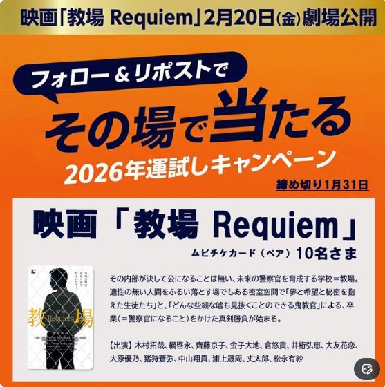 懸賞情報その場で当たる映画『 教場 Requiem』のムビチケがその場で当たるXキャンペーン 懸賞名:プレゼントキャンペーン当選賞品:映画『 教場 Requiem』ムビチケ当選人数:10名様応募条件:X(Twitter)アカウントでその場で当たる企業名:NST新潟総合テレビ この懸賞に応募する2026年01月31日(残り9日) 見逃せない懸賞ドラゴンクエスト 職業Tシャツ / ギフトペイ 10円1,500名様 / 98,500名様JTBえらべるギフト&JTBトラベルギフト / シャープ ヘルシオ ホットクック 他各回10名様 / 各回20名様 他【無料体験可能】子ども向け「習い事・プログラミング教室」ソニー・ピクチャーズ コラボ オリジナルムービーTシャツ1,000名様PayPayポイント 2,026ポイント500名様豪華賞品(月替り)賞品によって異なります 応募可能な懸賞関連する当選報告 お店では売っていない特別なカレ・ド・ショコラが当たるレシートキャンペーン!毎月末日Wチャンスもアリ!カタログギフトや商品券も当たる、冬のパズル誌まつりキャンペーン残り27日おそうじギフトカードやフィルたんグッズが当たるクローズドキャンペーン残り3日山中柔太朗さんアクスタやダーマレーザーパック全種類も当たるレシート懸賞残り9日やかんの濃麦茶 3ケースが当たる初恋ソングリクエストキャンペーン締切日不明全プレ☆素敵な商品と交換できるポイントキャンペーン!残り159日 森永乳業「マウントレーニア Rich Cafe Latte お試しキャンペーン」ロート製薬のキャンペーンで「きちんと保湿ケアセット」が当選しました☆ノートンのTwitter懸賞で「等身大ドラえもんバスタオル」が当選しました!コノミヤのクローズド懸賞で「お楽しみセット」が当選しました!KAGOME「カゴメ夏のプレミアム 先行体験キャンペーン」に当選しました♪KIRIN「#スミノフまさかのテイスト キャンペーン」が当選しました☆ 関連情報: X懸賞(Twitter懸賞)オープン懸賞ネット懸賞その場で当たるチケット・招待券SNS懸賞懸賞情報 招待券・入場券・チケット映画・試写会 HOME懸賞情報応募方法SNS懸賞X懸賞(Twitter懸賞)映画『 教場 Requiem』のムビチケがその場で当たるXキャンペーン 2026年01月22日 更新:ものりんず@懸賞主婦【厳選】毎日応募 【全て】毎日応募 年末年始懸賞