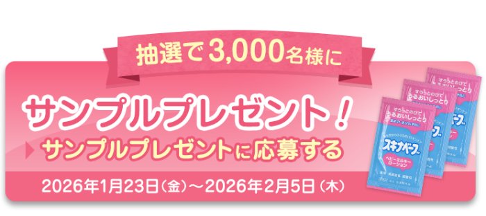 懸賞情報無料サンプルスキナベーブのベビーミルキーローションがサンプルでお試しできるキャンペーン 懸賞名:スキナベーブ「ベビーミルキーローション」当選賞品:ベビーミルキーローション サンプル当選人数:3,000名様応募条件:アンケートに答えて応募企業名:持田ヘルスケア この懸賞に応募する2026年02月05日(残り9日) 見逃せない懸賞Amazonギフトカード 2,000円分2,000名様宮舘涼太 クリアファイル / キッザニア招待券 / ピザーラネットクーポン 2,500円分2,000名様 / 合計400組1,600名様 / 200名様電動自転車 / ベビーラック / iRobot ルンバ ほか合計1,098名様オリエンタルカレーオリジナルグッズ毎月500名様電子マネー 最大1,000円分5,000名様カタログギフト / Amazonギフトカード 500円分5名様 / 50名様 応募可能な懸賞関連する当選報告 【イオングループ×ZONe】NIKKEオリジナルQUOカードセットが当たるキャンペーン残り4日最大1万円分のQUOカードPayが当たるオートバックスの会員限定キャンペーン残り4日先着当選!必ずもらえるエリエールのお得なキャッシュバックキャンペーン残り17日【ドン・キホーテ×アピタ・ピアゴ・ユーストア×サッポロビール】お酒やグラスセットが当たるクローズド懸賞残り12日300名様に最大1万円分のえらべるPayが当たるXキャンペーン残り1日ディズニーパークチケットやパークグッズが当たる豪華雑誌限定キャンペーン♪毎月開催 Aprica「ブレスエアー クッション」が当選しました!新日本スーパーマーケット同盟×日清のハガキ懸賞で「どん兵衛食べ比べセット」が当選しました☆Yストア・グリコのキャンペーンで「お菓子詰め合わせ」が当選しました!「キッザニア招待券」が日世のキャンペーンで当選しました!buzzLifeでこだわりカカオセットの商品モニターに当選しました!LOTTE「ACUO オリジナル 松坂桃李 QUOカード 5,000円分」が当選しました♪ 関連情報: 育児・子育て懸賞オープン懸賞ネット懸賞無料サンプル・試供品大量当選ベビー・キッズ・おもちゃ懸賞情報 スキンケア赤ちゃん・育児用品 HOME懸賞情報応募方法ネット懸賞スキナベーブのベビーミルキーローションがサンプルでお試しできるキャンペーン 2026年01月26日 更新:ものりんず@懸賞主婦【厳選】毎日応募 【全て】毎日応募 年末年始懸賞