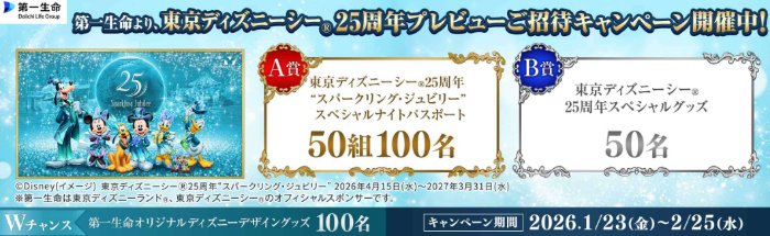 懸賞情報ディズニーシー“スパークリング・ジュビリー”スペシャルナイト招待券も当たる豪華懸賞 懸賞名:東京ディズニーシー 25周年“スパークリング・ジュビリー”スペシャルナイトご招待キャンペーン当選賞品&当選人数:A賞:東京ディズニーシー25周年"スパークリング・ジュビリー"スペシャルナイトパスポート(50組100名様)B賞:東京ディズニーシー25周年スペシャルグッズ(50名様)応募条件:会員登録して応募企業名:第一生命 この懸賞に応募する2026年02月25日(残り29日) 見逃せない懸賞葬送のフリーレングッズ、えらべるPay など賞品によって異なりますスノーギア、リフト券など合計1,260名様JTB カタログギフト1名様Amazonギフトカード 1,000円分1,000名様Toffy エアフライヤーミニ&ミニボウル / Qoo着るブランケット 他150名様 / 150名様 他電動自転車 / ベビーラック / iRobot ルンバ ほか合計1,098名様 応募可能な懸賞関連する当選報告 人気40ブランドからのスペシャル・プレゼントが抽選で当たるキャンペーン残り7日乾燥さんのふき取りエッセンスがその場で当たるXキャンペーン(本日最終日!!)ディズニーシー貸切パーティー招待券やディズニーチケットも当たるカルビーの豪華懸賞残り125日宿泊券やグルメ、観覧チケットなども当たるテレビ大阪のプレゼントキャンペーン!随時開催(賞品によって異なります)メナード商品が毎月当たる会員限定プレゼントキャンペーン☆残り4日イオンギフトカード3,000円分がその場で当たるXキャンペーン残り10日 日本チェーンストア協会のキャンペーンで「すてきな商品詰め合わせ」が当選しました!ママこえモニター「ウテナ シンプルバランス セット」が当選しました♪YogiboのTwitter懸賞で「Yogiboインゴットチョコ」が当選しました♪フマキラー「QUOカード 5,000円分」が当選しました!buzzlife「カルピスのチカラを発見(アサヒ飲料株式会社)プロジェクト」アオキスーパー×一正蒲鉾のハガキ懸賞で「アオキスーパーのお買い物券 1,000円分」が当選しました! 関連情報: ディズニー懸賞オープン懸賞ネット懸賞豪華・高額懸賞チケット・招待券遊園地・テーマパーク・イベントベビー・キッズ・おもちゃ懸賞情報 アニメ・キャラクターテーマパーク・レジャースポット東京高額賞品・高級品関東(茨城・栃木・群馬・埼玉・千葉・東京・神奈川)特別な体験|夢の実現招待券・入場券・チケット会員登録WチャンスDisney|ディズニー第一生命 HOME懸賞情報ジャンル遊園地・テーマパーク・イベントディズニー懸賞ディズニーシー“スパークリング・ジュビリー”スペシャルナイト招待券も当たる豪華懸賞 2026年01月27日 更新:ものりんず@懸賞主婦【厳選】毎日応募 【全て】毎日応募 年末年始懸賞
