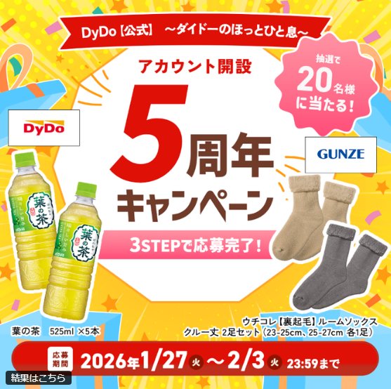 懸賞情報その場で当たるダイドー 葉の茶とグンゼのあったか靴下がその場で当たるXキャンペーン 懸賞名:おかげさまでアカウント開設5周年当選賞品:ダイドー 葉の茶&グンゼ あったか靴下当選人数:20名様応募条件:X(Twitter)アカウントでその場で当たる企業名:ダイドー この懸賞に応募する2026年02月03日(残り6日) 見逃せない懸賞Toffy エアフライヤーミニ&ミニボウル / Qoo着るブランケット 他150名様 / 150名様 他大人気アイテムや豪華体験 / ツルハポイント or WAON POINT 1,000ポイント1,100名様 / 5,000名様妊婦さん必見!無料で試せる「紙おむつ・粉ミルク」のお得情報 BEST10♪クスリのアオキギフトカード 3万円分 / スヌーピーグッズ300名様 / 合計7,000名様QUOカードPay 最大3,000円分1,450名様宝商品詰め合わせ50名様 応募可能な懸賞関連する当選報告 QUOカードPayがその場で当たる「0」のつく日限定Xキャンペーン毎月0のつく日に開催ASTRO BOTオリジナルデザインTシャツやデスクマットが当たるキャンペーン残り3日サンリオの幼児向け英語教材がお試しできる無料モニターキャンペーン常時募集中インスタントラーメン詰め合わせなどが当たるクイズラリーキャンペーン2026年03月30日(毎週火曜日に更新)5,000円分のQUOカードPayが当たる豪華Xキャンペーン!平日のみ開催総額250万円相当の豪華賞品が当たる越後製菓のお年玉キャンペーン残り3日 Ayurspa(アユルスパ)「詰め合わせ」が当選しました☆ドン・キホーテ×ロート製薬の懸賞で「スキンケアセット」が当選しました!buzzLife「奇跡!?の198kcalを体験 第2弾(日清食品)プロジェクト」に参加決定!東海ラジオ・キンレイのハガキ懸賞で「キンレイ詰め合わせ」が当選しました♪集英社「エンリッチセラム CB・エンリッチドクリーム CB サンプル」マルハニチロ「フルティシエちょっと贅沢 3個セット」が当選しました! 関連情報: X懸賞(Twitter懸賞)オープン懸賞その場で当たるネット懸賞SNS懸賞食品・飲料懸賞情報ファッション・アクセ・貴金属 ファッション・衣料品ドリンク・飲料お茶・紅茶DyDo|ダイドー HOME懸賞情報応募方法SNS懸賞X懸賞(Twitter懸賞)ダイドー 葉の茶とグンゼのあったか靴下がその場で当たるXキャンペーン 2026年01月28日 更新:ものりんず@懸賞主婦【厳選】毎日応募 【全て】毎日応募 年末年始懸賞