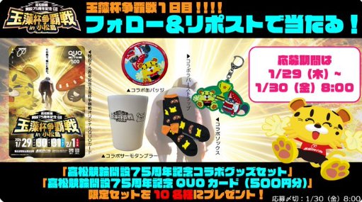 懸賞情報記念コラボグッズセットが当たる高松競輪場の毎日応募Xキャンペーン 懸賞名:高松競輪開設75周年記念玉藻杯争覇戦in小松島キャンペーン当選賞品:記念コラボグッズセット当選人数:10名様応募条件:X(Twitter)アカウントで毎日応募企業名:高松競輪場 この懸賞に応募する2026年02月01日(残り3日) 見逃せない懸賞4K液晶テレビ / バルミューダ 空気清浄機 / Dyson 掃除機 他50名様 / 50名様 / 50名様 他電子マネー 1,000円分1,000名様JTB カタログギフト1名様『生梅飴』の”なか”合計1,500名様Toffy ミルクフォーマーマグ / えらべるPay 500ポイント100名様 / 900名様はじめてのベビースタイ応募者全員 応募可能な懸賞関連する当選報告 【定期開催】最新人気家電などが当たるエディオンのX懸賞!随時開催サントリー セサミンEXが無料でモニターできるお得なキャンペーン不定期開催ブレンディ カフェラトリーセットがその場で当たるX懸賞残り2日お店では売っていない特別なカレ・ド・ショコラが当たるレシートキャンペーン!毎月末日先着当選!キッザニア東京の貸切イベント招待券が当たるANAマイレージクラブ会員限定キャンペーン残り1日ユニクロ商品がお試しできる、レビュー投稿キャンペーン残り13日 石丸製麺「煮込みカレーうどん プレゼント」ミキハウスのキャンペーンで「図書カード500円分」が当選しました!ポチカム「SK-II自信の美容液『SK-IIステムパワー』サンプルプレゼント」に当選!ライオン「キレイキレイ除菌セット」が当選しました☆サッポロビールのLINE懸賞で「LINEポイント5,000ポイント」が当選しました♪ライスショップ米蔵のキャンペーンで「兵庫県産 ヒノヒカリ 5kg」が当選しました! 関連情報: X懸賞(Twitter懸賞)オープン懸賞毎日応募ネット懸賞現金・金券・ギフト券SNS懸賞懸賞情報生活用品・雑貨・家具 けいりん|競輪詰め合わせ・セット食器・グラスQUOカード HOME懸賞情報応募方法SNS懸賞X懸賞(Twitter懸賞)記念コラボグッズセットが当たる高松競輪場の毎日応募Xキャンペーン 2026年01月29日 更新:ものりんず@懸賞主婦【厳選】毎日応募 【全て】毎日応募 年末年始懸賞
