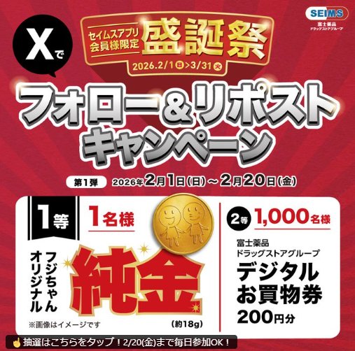 懸賞情報その場で当たるオリジナル純金やデジタル買い物券がその場で当たる豪華Xキャンペーン 懸賞名:セイムスアプリ盛誕祭当選賞品&当選人数:オリジナル純金(1名様)デジタル買い物券 200円分(1,000名様)応募条件:X(Twitter)アカウントで毎日その場で当たる企業名:セイムス この懸賞に応募する2026年02月20日(残り18日) 見逃せない懸賞JTBトラベルギフト 5万円分 / ハンディクリーナー / カタログギフト 他各回5名様 / 各回20名様 / 各回30名様 他デジタルギフト 500円相当 / 特製鍋焼うどん / 鍋島焼のプレミアムどんぶり10,000名様 / 2,000名様 / 300名様ベルメゾンのおすすめ商品(毎週変動)賞品によって異なりますTinyTANデザインドリンクチケット / PayPayポイント 1,000ポイント50,000名様 / 1,000名様ヘナカラートリートメント無料サンプル応募者全員Dyson コードレス掃除機 / 電動アシスト自転車 / combi ベビーカー 他1名様 / 1名様 / 1名様 他 応募可能な懸賞関連する当選報告 オリジナルQUOカードが当たるホクトのクローズドキャンペーン残り26日アラウ.ベビーのマタニティクリームがお試しできるキャンペーン!毎月末日葬送のフリーレングッズやえらべるPayなどが当たるアサヒ飲料の自販機限定キャンペーン2026年03月31日(全2回開催)選べる日帰りバスツアーやサントリー胡麻麦茶が当たるクローズドキャンペーン残り10日バースデー花束が当日届く素敵なキャンペーン♪毎日0:00~10:00のみ開催優秀作品はラジオで詠まれる、YAYOIの「壁紙川柳」随時募集 日本ハムのハガキ懸賞で「麦わらの一味タンブラーセット」が当選しました♪ドンレミーのX懸賞で「冷凍ミルクレープ」が当選しました!スギ薬局×ユニリーバのハガキ懸賞で「商品券 1,000円分」が当選しました♪フィール・サッポログループ・宝幸・日本ルナのハガキ懸賞で「商品詰め合わせ」が当選しました!9社主催のハガキ懸賞で「家庭用品詰め合わせ」が当選しました♪コノミヤ・日清フーズのハガキ懸賞で「クリスマスケーキ」が当選しました☆ 関連情報: X懸賞(Twitter懸賞)オープン懸賞毎日応募その場で当たるネット懸賞豪華・高額懸賞現金・金券・ギフト券大量当選SNS懸賞懸賞情報ファッション・アクセ・貴金属 宝石・貴金属・純金・ジュエリー高額賞品・高級品ギフトコード|デジタルギフト富士薬品 HOME懸賞情報応募方法SNS懸賞X懸賞(Twitter懸賞)オリジナル純金やデジタル買い物券がその場で当たる豪華Xキャンペーン 2026年02月02日 更新:ものりんず@懸賞主婦【厳選】毎日応募 【全て】毎日応募 年末年始懸賞