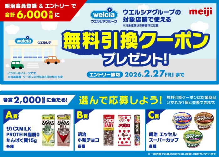 懸賞情報ウエルシアグループで使える無料引換券が当たる大量当選キャンペーン 懸賞名:ウエルシアグループで使える無料引換券プレゼントキャンペーン当選賞品:ウエルシアグループで使える無料引換券当選人数:6,000名様応募条件:会員登録して応募企業名:明治 この懸賞に応募する2026年02月27日(残り16日) 見逃せない懸賞デジタルKFCカード 1,000円分7,000名様電子マネー 最大1,000円分5,000名様BEAUTY & YOUTH UNITED ARROWS コラボPCリュック / e-GIFT 3,000円分1,000名様 / 500名様8×4デオドラントパテ無料サンプル対象者全員貸切招待+トイ・ストーリーホテル宿泊券 / 貸切招待チケット / パークチケット50組100名様 / 合計4,450組12,900名様 / 1,000組2,000名様気になっていたあの商品をお得に試せるサイト「サンプル百貨店」 応募可能な懸賞関連する当選報告 【定期開催】豪華家電が当たる!ヨドバシカメラのX懸賞定期開催新しくなったジムビームソーダのコンビニ引換クーポンがその場で当たる大量当選懸賞残り5日無料でパンパース オムツが当たる会員限定キャンペーン!毎月抽選サービスエリアのお土産セットなどが当たる西日本高速道路サービスのキャンペーン残り2日毎月開催☆金麦6缶が当たるアンケートキャンペーン!毎月末日アマギフやHMV&BOOKS online 限定クーポンなどが当たるローチケ購入キャンペーン(本日最終日!!) イートアンドのハガキ懸賞で「大阪王将詰め合わせ」が当選しました♪イトーヨーカ堂・AGFのハガキ懸賞で「プチ・ラムカン・ダムール・セット」が当選しました♪ヤマナカ×プリマハムのレシート懸賞で「レゴランド・ジャパン 1DAYパスポート」が当選しました!オークワ・パレマルシェ&寿がきやのハガキ懸賞で「プレミアムSugakiyaラーメン」が当選しました!イオンクレジット「公共料金キャンペーン」キューピー「キューピー製品詰め合わせ」が当選しました☆ 関連情報: オープン懸賞ネット懸賞大量当選無料クーポン・引換券狙い目・穴場懸賞懸賞情報 ウエルシア会員登録meiji|明治 HOME懸賞情報応募方法ネット懸賞ウエルシアグループで使える無料引換券が当たる大量当選キャンペーン 2026年02月02日 更新:ものりんず@懸賞主婦【厳選】毎日応募 【全て】毎日応募 年末年始懸賞