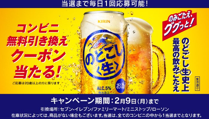 懸賞情報その場で当たるのどごし<生>の コンビニ無料引き換えクーポンが当たる大量当選LINE懸賞 懸賞名:のどごし<生> コンビニ無料引き換えクーポンが当たる!キャンペーン当選賞品:のどごし<生> コンビニ無料引き換えクーポン当選人数:18万名様応募条件:LINEアカウントで応募企業名:キリンビール この懸賞に応募する2026年02月09日(残り6日) 見逃せない懸賞シャープ プラズマクラスター ドレープフロードライヤー / バルミューダ バルミューダ ザ・トースター / Meta Quest 3S 128GB / デジタルギフト各回50名様 / 各回50名様 / 各回50名様 / 100,000名様クリア アサヒ コンビニ無料引換えクーポン200,000名様カウネット オリジナル商品毎月50名様Toffy エアフライヤーミニ&ミニボウル / Qoo着るブランケット 他150名様 / 150名様 他PayPayポイント 1,000円分 / ビッグクッション10,000名様 / 100名様ワイドパンツ / ドライ杢プリントTシャツ商品モニター6名様 / 3名様 応募可能な懸賞関連する当選報告 テンスターのカラーシャンプーがお試しできる得なキャンペーン!締切日不明深澤辰哉・渡辺翔太のオリジナルクリアファイルやオリジナル鍋が当たるキャンペーン2026年03月31日(全2回開催)【ベイシア×プリマハム】東京ディズニーランド ザ・ダイヤモンドホースシュー 貸切ご招待(本日最終日!!)はま寿司食事券や醤油セットなども当たるクローズドキャンペーン残り32日Amazonギフトカード5,000円分がその場で当たる毎日応募LINEキャンペーン残り5日バルミューダや加湿空気清浄機が当たるママさん向けアンケート懸賞♪毎月抽選 ぐるっぱ お菓子モニター「すいーつ浪漫 和三盆・抹茶ブールドネージュ」が当選しました!フィール×サッポロのキャンペーンで「ヱビス4種の味わいセット」が当選しました!「SUNSTAR ファミリーミュージカル 2016」が当選しました!JA西春日井「クロスワードクイズ」ママこえ「モニター謝礼 図書カード1,000円分」をいただきました♪DHC「海洋深層水 無料お試し6本セット」の懸賞に当選しました! 関連情報: オープン懸賞LINE懸賞毎日応募その場で当たるネット懸賞大量当選無料クーポン・引換券SNS懸賞狙い目・穴場懸賞懸賞情報 お酒クーポン・無料券キリン HOME懸賞情報応募方法SNS懸賞LINE懸賞のどごし<生>の コンビニ無料引き換えクーポンが当たる大量当選LINE懸賞 2026年02月03日 更新:ものりんず@懸賞主婦【厳選】毎日応募 【全て】毎日応募 年末年始懸賞
