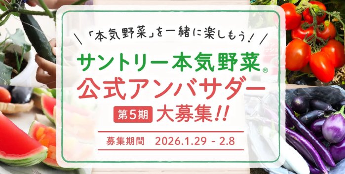 懸賞情報商品モニターサントリー本気野菜の公式アンバサダー募集キャンペーン キャンペーン名:「サントリー本気野菜」第5期公式アンバサダーを大募集!当選賞品:サントリー本気野菜 公式アンバサダー当選人数:不明応募条件:アンケートに答えて応募企業名:サントリーコメント:※サントリー本気野菜公式と一緒に「サントリー本気野菜」をInstagram上で盛り上げてくださる方 など条件あり この懸賞に応募する2026年02月08日(残り3日) 見逃せない懸賞TinyTANデザインドリンクチケット / PayPayポイント 1,000ポイント50,000名様 / 1,000名様星野リゾート宿泊ギフト 50,000円分 / サンドラッグポイント 1,000pt / ライオン対象商品引換クーポン100名様 / 2,500名様 / 3,000名様コンパクトソファー / 木製すのこローベッド商品モニター2名様 / 2名様PayPayポイント 1,000円分 / ビッグクッション10,000名様 / 100名様スギ薬局専用QUOカードPay 100円分10,000名様パンパース オムツ毎月1名様 応募可能な懸賞関連する当選報告 1,000名様に最大10,000円分のえらべるPayが当たる大量当選X懸賞残り3日先着当選!必ずもらえるエリエールのお得なキャッシュバックキャンペーン残り8日タブレットで学ぶ幼児、小・中・高校生向け通信教育「スマイルゼミ」の無料資料請求♪常時募集中Amazonギフトカード500円分が500名様にその場で当たるSkyのX懸賞残り23日全プレ!コズレオリジナルデザイン「出生届」がもらえるメルマガ登録キャンペーン常時募集中JCBギフトカードやカタログギフトも当たる森永乳業のクローズドキャンペーン残り23日 JTBのキャンペーンで「IRODORIカレーセット」が当選しました!AGFのキャンペーンで「AGF商品詰め合わせ」が当選しました♪バロー×ミツカンのハガキ懸賞で「山形牛しゃぶしゃぶ用肉」が当選しました!Suntory「パンプキンスペシャル 先行体験キャンペーン」オークワ×P&Gのハガキ懸賞で「P&Gスッキリ清潔セット」が当選しました!アサヒ飲料のハガキ懸賞で「アミールSと新商品のセット」が当選しました! 関連情報: オープン懸賞ネット懸賞Instagram懸賞SNS懸賞商品モニター懸賞情報その他 限定条件あり懸賞花・種・ガーデニング用品野菜・フルーツアンバサダーサントリー HOME懸賞情報応募方法ネット懸賞サントリー本気野菜の公式アンバサダー募集キャンペーン 2026年02月05日 更新:ものりんず@懸賞主婦【厳選】毎日応募 【全て】毎日応募 年末年始懸賞