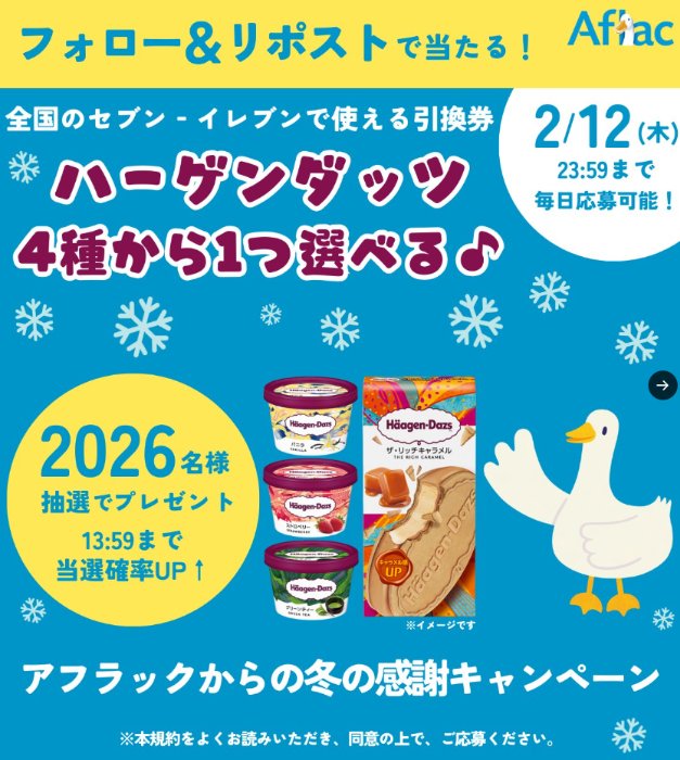 懸賞情報その場で当たるハーゲンダッツのセブン‐イレブン引換クーポンが当たる大量当選X懸賞 懸賞名:冬の感謝キャンペーン当選賞品:ハーゲンダッツ セブン‐イレブン引換クーポン当選人数:2,026名様応募条件:X(Twitter)アカウントで毎日その場で当たる企業名:アフラック この懸賞に応募する2026年02月12日(残り6日) 見逃せない懸賞サントリー DHA&EPA+セサミンEX1万名様リポビタンファイン 10本セット50名様BEAUTY & YOUTH UNITED ARROWS コラボPCリュック / e-GIFT 3,000円分1,000名様 / 500名様ジッパーバッグ / キーホルダー / QUOカード 500円分1,000名様 / 300名様 / 200名様Amazonギフトカード 2,000円分2,000名様妊婦さん必見!無料で試せる「紙おむつ・粉ミルク」のお得情報 BEST10♪ 応募可能な懸賞関連する当選報告 Amazonギフトカード1,000円分がその場で当たるXキャンペーン残り7日選手直筆サイン入りアジパンダぬいぐるみやVISA eギフトが当たる味の素のクローズド懸賞残り22日3,000円分のQUOカードPayが当たるクイズキャンペーン!毎週金曜日開催毎月開催!沢の鶴製品が当たるクイズキャンペーン毎月開催1,200名様にデジタルポイントや牛丼の具が当たる備後漬物のクローズドキャンペーン2026年02月28日(全3回抽選)タブレットで学ぶ幼児、小・中・高校生向け通信教育「スマイルゼミ」の無料資料請求♪常時募集中 小野万のレシート懸賞で「塩辛セット」が当選しました!フィール×はごろもフーズのハガキ懸賞で「ジャンボ海水プール招待券」が当選しました!花王「SOFINA iP クロロゲン酸 飲料」の無料モニターに当選しました!オークワ×日清のハガキ懸賞で「日清食品詰め合わせ」が当選しました♪ロート製薬のキャンペーンで「きちんと保湿ケアセット」が当選しました☆花王「キュキュット ポンプの4本セット」が当選しました☆ 関連情報: X懸賞(Twitter懸賞)オープン懸賞毎日応募その場で当たるネット懸賞大量当選無料クーポン・引換券SNS懸賞懸賞情報 クーポン・無料券ハーゲンダッツ HOME懸賞情報応募方法SNS懸賞X懸賞(Twitter懸賞)ハーゲンダッツのセブン‐イレブン引換クーポンが当たる大量当選X懸賞 2026年02月06日 更新:ものりんず@懸賞主婦【厳選】毎日応募 【全て】毎日応募 年末年始懸賞