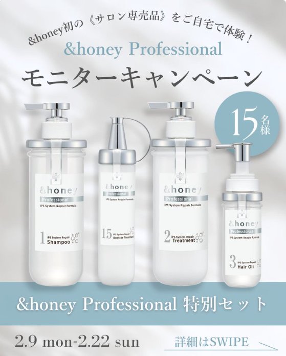懸賞情報商品モニター サロン専売品&honey Professionalがお試しできるモニターキャンペーン キャンペーン名:サロン専売品&honey Professional モニターキャンペーン当選賞品:サロン専売品&honey Professional商品モニター当選人数:15名様応募条件:X(Twitter)アカウントで応募企業名:&honeyコメント:※2026年4月15日(水)までに指定ハッシュタグを付けて感想を投稿 など条件あり この懸賞に応募する2026年02月22日(残り10日) 見逃せない懸賞 現金 最大1万円 / デジタルポイント 30pt1,000名様 / 対象商品を購入して必ずもらえる『生梅飴』の”なか”合計1,500名様気になっていたあの商品をお得に試せるサイト「サンプル百貨店」味の素商品やオリジナルグッズなど賞品によって異なりますデジタルギフト 200円分10,000名様日本旅行で使えるクーポン対象者全員 応募可能な懸賞 関連する当選報告 5,000円分のディズニーリゾート・ギフトカードも当たる「ディズニーファン」定期購読キャンペーン2026年03月15日(全2回抽選)1,000名様にポケモン・ガリガリ君 アウトドアグッズが当たるハガキ懸賞2026年04月30日(全3回開催)すっきり収納できるキャリーボックスがお試しできる商品モニターキャンペーン残り24日ライオン製品が当たるポイントプログラムキャンペーン♪毎月開催対象のローソンオリジナルのむヨーグルトの無料券がその場で当たる大量当選X懸賞残り3日毎月開催!入眠グッズやワコールのパジャマも当たるX投稿キャンペーン!毎月開催 3Mのハガキ懸賞で「リストランテ・サバティーニ青山 アイスセット」が当選しました☆LaLa TVのキャンペーンで「OVER DRIVEのムビチケ」が当選しました☆日本製粉のハガキ懸賞で「サンリオキャラクターズ バスタオル」が当選しました☆glico「#おつかれさまです ジャイアントコーン ツイッターキャンペーン」GEORGIA「EUROPEANシリーズ体験キット」マックスバリュ×明治のハガキ懸賞で「富士急ハイランド ペアチケット」が当選しました♪ 関連情報: X懸賞(Twitter懸賞)オープン懸賞ネット懸賞SNS懸賞商品モニター美容・健康・コスメ懸賞情報 限定条件あり懸賞ヘアケア・ヘアカラー HOME懸賞情報応募方法SNS懸賞X懸賞(Twitter懸賞)サロン専売品&honey Professionalがお試しできるモニターキャンペーン 2026年02月10日 更新:ものりんず@懸賞主婦 【厳選】毎日応募 【全て】毎日応募 年末年始懸賞