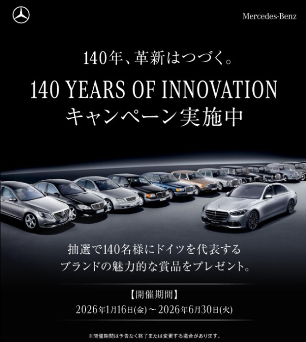 懸賞情報ドイツを代表するブランドの魅力的な賞品が当たるメルセデス・ベンツのキャンペーン 懸賞名:140 YEARS OF INNOVATION キャンペーン当選賞品:ドイツを代表するブランド賞品当選人数:140名様応募条件:専用フォームより試乗リクエストまたは、購入相談をお申し込みいただき、店頭にて新車お見積りを取得された方企業名:メルセデス・ベンツ この懸賞に応募する2026年06月30日(残り140日) 見逃せない懸賞JTBトラベルギフト 最大10万円分 / ドライブレコーダー / カタログギフト 他8名様 / 3名様 / 合計14名様 他クリア アサヒ コンビニ無料引換えクーポン200,000名様Disneyのおしりふき毎月1名様深澤辰哉・渡辺翔太クリアファイル / 大阪王将オリジナル鍋2,800名様 / 200名様アサヒゼロ コンビニ無料引換えクーポン205,000名様カタログギフト / Amazonギフトカード 500円分5名様 / 50名様 応募可能な懸賞関連する当選報告 妊娠期から産後まで使えるピジョンの商品サンプルがもらえるキャンペーン!締切日不明バルミューダや加湿空気清浄機が当たるママさん向けアンケート懸賞♪毎月抽選オバジ美容液のサンプルが当たるXキャンペーン残り10日キユーピー商品やオリジナルグッズが当たるポイントキャンペーン随時開催テンスターHena プレミアムカラートリートメントがお試しできるサンプルキャンペーン締切日不明最大10,000円分のAmazonギフトコードがその場で当たるX懸賞残り2日 Suntory「特茶カフェインゼロの6本セット」が当選しました♪ヤマナカ×紀文食品のハガキ懸賞で「大相撲名古屋場所 入場券」が当選しました!月刊cheek プレゼントキャンペーンEDION「阿蘇あか牛ハンバーグ」が当選しました☆DCM&花王のハガキ懸賞で「アタックNeo抗菌EX Wパワー」が当選しました☆丸美屋のハガキ懸賞で「丸美屋商品詰め合わせ」が当選しました☆ 関連情報: オープン懸賞ネット懸賞家電・デジタル機器豪華・高額懸賞懸賞情報生活用品・雑貨・家具 試乗・モニターキッチングッズ|調理器具店内・現地食器・グラス高級ブランド生活家電メルセデス・ベンツ HOME懸賞情報応募方法ネット懸賞ドイツを代表するブランドの魅力的な賞品が当たるメルセデス・ベンツのキャンペーン 2026年02月10日 更新:ものりんず@懸賞主婦【厳選】毎日応募 【全て】毎日応募 年末年始懸賞