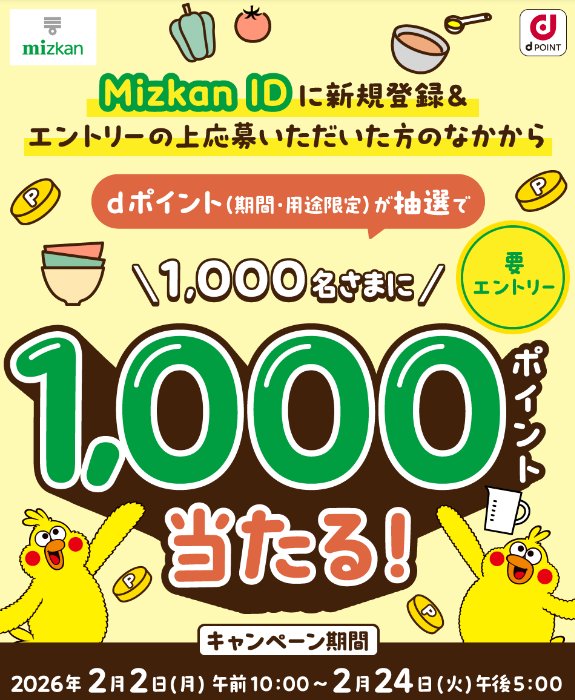 懸賞情報1,000名様にdポイント1,000ポイントが当たるミツカンID新規登録キャンペーン 懸賞名:【dポイントクラブ】【ミツカン】抽選で1,000名さまに1,000ポイント当たる!当選賞品:dポイント 1,000ポイント当選人数:1,000名様応募条件:会員登録して応募企業名:NTT この懸賞に応募する2026年02月24日 17時00分(残り9日) 見逃せない懸賞NOV[ノブ]シリーズ サンプルセット応募者全員えらべるPay 300円相当10,000名様サンリオの幼児向け英語教材がお試しできる無料モニターキャンペーン大人気アイテムや豪華体験 / ツルハポイント or WAON POINT 1,000ポイント1,100名様 / 5,000名様ジッパーバッグ / キーホルダー / QUOカード 500円分1,000名様 / 300名様 / 200名様妊婦さん必見!無料で試せる「紙おむつ・粉ミルク」のお得情報 BEST10♪ 応募可能な懸賞関連する当選報告 毎週抽選!ぴゅあ&たっち無料サンプルセットが当たるキャンペーン毎週抽選雪印メグミルクのおすすめ商品が当たる会員限定キャンペーン残り5日オーシャンキングの極しっとりかにごこちが30名様にその場で当たるXキャンペーン残り14日【アプリ懸賞】体験プログラムやカルビー商品に応募できるキャンペーン♪随時開催毎月開催!牛乳石鹸商品セットが当たる定期キャンペーン!毎月開催毎月開催!JA宮崎の広報誌アンケートキャンペーン!毎月開催 P&G「myレシピ.com『BRAUN Oral-b モニタープレゼント』」バロー×おやつカンパニーのハガキ懸賞で「名古屋港水族館 親子4名分チケット」が当選しました!イセ食品のハガキ懸賞で「らくやきマーカー+プレートセット」が当選しました!3Mのハガキ懸賞で「リストランテ・サバティーニ青山 アイスセット」が当選しました☆大王製紙のハガキ懸賞で「選べる鍋グルメカタログ」が当選しました!glico「ハッピーキャッチャーキャンペーン」 関連情報: オープン懸賞ネット懸賞現金・金券・ギフト券大量当選懸賞情報 電子マネー・ポイント会員登録ミツカンNTT|ドコモ|OCN HOME懸賞情報応募方法ネット懸賞1,000名様にdポイント1,000ポイントが当たるミツカンID新規登録キャンペーン 2026年02月10日 更新:ものりんず@懸賞主婦【厳選】毎日応募 【全て】毎日応募 年末年始懸賞
