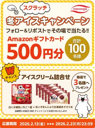 懸賞情報その場で当たる Amazonギフトカード500円分がその場で100名様に当たるXキャンペーン 懸賞名:冬アイススクラッチキャンペーン当選賞品:Amazonギフトカード 500円分当選人数:100名様応募条件:X(Twitter)アカウントで毎日その場で当たる企業名:丸永製菓 この懸賞に応募する2026年02月23日(残り10日) 見逃せない懸賞 明治ポイント 200pt各月2,000名様えらべるPay 最大50,000円分 / Coke ON ドリンクチケット1,001名様 / 1,000名様月刊ポピーの無料おためし見本応募者全員ONE BY KOSE 美容液サンプル10,000名様サントリー セサミンEX 商品モニター1万名様幼児、小・中・高校生向け通信教育「スマイルゼミ」無料資料希望者全員 応募可能な懸賞 関連する当選報告 【ジョイフル】コラボオリジナルデザインクリアボトルやデジタル食事券が当たるキャンペーン残り18日特製アクリルキーホルダーが当たるムビチケ前売り券購入者限定キャンペーン残り74日1万円分のQUOカードが当たるTHERMOSの製品アンケートキャンペーン!年2回抽選FIFAワールドカップ2026 日本戦チケット または えらべるPayが当たる豪華懸賞残り31日最大1万円相当のガシャポンオンラインショップで使えるクーポンが当たるLINE懸賞締切日不明10,000円分のAmazonギフトカードがその場で当たる豪華X懸賞(本日最終日!!) KAGOME「カゴメ夏のプレミアム 先行体験キャンペーン」に当選しました♪エリエールのTwitter懸賞で「旅行券3万円分」が当選しました☆Coca-Cola「エメマン おつかれメッセージ缶6本セット」が当選しました♪西友×花王のキャンペーンで「花王商品詰め合わせ」が当選しました!KOSEのTwitter懸賞で「ジュレームアミノ セット」が当選しました☆フィニッシュ「やさしくて強いママ応援キャンペーン」が当選しました☆ 関連情報: X懸賞(Twitter懸賞)オープン懸賞毎日応募その場で当たるネット懸賞現金・金券・ギフト券SNS懸賞懸賞情報 Amazonギフト券商品券・ギフト券・金券 HOME懸賞情報応募方法SNS懸賞X懸賞(Twitter懸賞)Amazonギフトカード500円分がその場で100名様に当たるXキャンペーン 2026年02月13日 更新:ものりんず@懸賞主婦 【厳選】毎日応募 【全て】毎日応募 年末年始懸賞