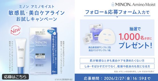 懸賞情報無料サンプルミノンの敏感肌・美白ケアラインがお試しできるサンプルプレゼントキャンペーン 懸賞名:敏感肌・美白ケアライン お試しキャンペーン当選賞品:美白美容液・美白マスク サンプル当選人数:1,000名様応募条件:アンケートに答えて応募企業名:ミノン この懸賞に応募する2026年02月27日 16時59分(残り14日) 見逃せない懸賞ギフトペイ 最大3万円分不明吉野家 冷凍牛丼の具セット / デジタルポイント 3,000円分600名様 / 600名様子どもにピッタリの教材が見つかる!幼児向け教材をまとめました♪ディズニー プライベート・イブニング・パーティー招待券 他各回合計1,000組2,500名様 他対象のローソンオリジナルのむヨーグルト無料券毎日1万名様ベビーカー / 抱っこ紐 / ベビーベッド / Amazonギフト 10,000円分 他1名様 / 1名様 / 1名様 / 3名様 他 応募可能な懸賞関連する当選報告 クラシエ商品やデジタルギフトが当たる会員限定キャンペーン残り17日玉子焼・お出汁ひまわりで利用できるデジタル食事券がその場で当たるキャンペーン残り11日ビックカメラギフトカードが当たる毎日応募Xキャンペーン残り8日えらべるPay1,000円分がその場で100名様に当たるXキャンペーン残り15日アテント下着爽快・下着気分の 紙パンツがお試しできるキャンペーン残り46日ギフトカードや有名店の食事券が当たる、地養鳥協会のクローズドキャンペーン残り46日 丸美屋のハガキ懸賞で「丸美屋商品詰め合わせ」が当たりました☆エバラ食品「がっつりにんにく VS さっぱりおろし対決キャンペーン」buzzLife「おうちでできるフッ素予防歯科(ライオン株式会社)プロジェクト」モニプラで「ナガシマスパーランド 親子ペアチケット」が当選しました☆オークワ×P&Gのハガキ懸賞で「P&Gスッキリ清潔セット」が当選しました!コスメルポのTwitter懸賞で「ホワイトデーBOX」が当選しました☆ 関連情報: オープン懸賞ネット懸賞無料サンプル・試供品大量当選美容・健康・コスメ懸賞情報 スキンケア化粧品・コスメ美容グッズ HOME懸賞情報応募方法ネット懸賞ミノンの敏感肌・美白ケアラインがお試しできるサンプルプレゼントキャンペーン 2026年02月13日 更新:ものりんず@懸賞主婦【厳選】毎日応募 【全て】毎日応募 年末年始懸賞