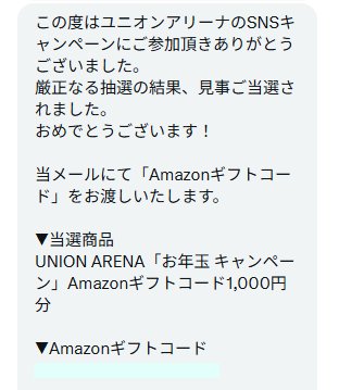 ユニオンアリーナのX懸賞で「Amazonギフトカード1,000円分」が当選しました!