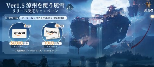 懸賞情報最大50,000円分のAmazonギフトカードが当たる毎日応募Xキャンペーン 懸賞名:リリース決定キャンペーン当選賞品:Amazonギフトカード 最大50,000円分当選人数:11名様応募条件:X(Twitter)アカウントで毎日応募企業名:風燕伝:Where Winds Meet この懸賞に応募する(応募期間終了)2026年03月31日今すぐ応募可能な懸賞はコチラから 見逃せない懸賞ブラックニッカ クリアハイボール コンビニ無料引換クーポン25万名様えらべるPay 200ポイント10,000名様ベビーカー / 抱っこ紐 / ベビーベッド / Amazonギフト 10,000円分 他1名様 / 1名様 / 1名様 / 3名様 他名探偵コナン オリジナルグッズ4,200名様目黒蓮さんノート&桜田ひよりさんシール40,000名様妊婦さん必見!無料で試せる「紙おむつ・粉ミルク」のお得情報 BEST10♪ 応募可能な懸賞関連する当選報告 毎月応募OK!サンスター製品が当たる会員限定キャンペーン毎月末日ANA国内線往復航空券がその場で当たる豪華LINEキャンペーン締切日不明ディズニー・オン・アイス招待券が当たるゆめカードの豪華キャンペーン残り23日お好きな「るるぶ」がもらえる、定期開催プレゼントキャンペーン♪定期開催【マルト×キッコーマン】キッコーマン・デルモンテ商品を買って当てよう!春のドリームキャンペーン残り46日デジコポイント1,000円分が当たる東京シティ競馬のレース予想キャンペーン2027年03月26日(大井競馬開催日 各日) 愛知トヨタのキャンペーンで「ドライブスルーギフトセット」が当選しました!SUNTORY「ボスグリーン 4週間体験モニター6,000名様募集!キャンペーン」紀文食品「JCBギフトカード 3,000円分」が当選しました♪プリマハムのキャンペーンで「香薫詰め合わせ&Tシャツ」が当選しました!エバラのキャンペーンで「ご当地牛12ヶ月分」が当選しました☆JRAのキャンペーンで「窓拭き用ロボット掃除機」が当選しました♪ 関連情報: X懸賞(Twitter懸賞)オープン懸賞毎日応募ネット懸賞豪華・高額懸賞現金・金券・ギフト券SNS懸賞懸賞情報 高額賞品・高級品Amazonギフト券商品券・ギフト券・金券 HOME懸賞情報応募方法SNS懸賞X懸賞(Twitter懸賞)最大50,000円分のAmazonギフトカードが当たる毎日応募Xキャンペーン 2026年03月27日 更新:ものりんず@懸賞主婦【厳選】毎日応募 【全て】毎日応募