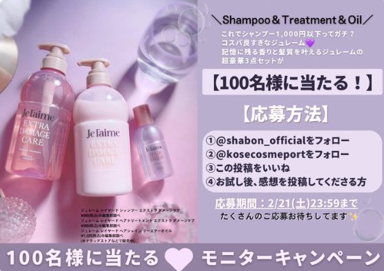 懸賞情報商品モニタージュレームの超豪華3点セットがお試しできるモニターキャンペーン キャンペーン名:モニターキャンペーン当選賞品:ジュレーム ヘアケア商品モニター当選人数:100名様応募条件:X(Twitter)アカウントで応募コメント:※お試し後、感想を投稿してくださる方 など条件あり この懸賞に応募する2026年02月21日(残り5日) 見逃せない懸賞無添加パテセット1,500名様コスメデコルテ 美白美容液サンプル10,000名様オリジナルフレークシール~プレママver~応募者全員富士薬品ドラッグストアグループ デジタル買い物券5,000名様侍ジャパンシリーズ 観戦チケット / バット型タンブラー / Coke ON ドリンクチケット50名様 / 2,000名様 / 200,000名様電動自転車 / ベビーラック / iRobot ルンバ ほか合計1,098名様 応募可能な懸賞関連する当選報告 選べる福袋が当たる、タカラトミーのクローズドキャンペーン2ヶ月に1度抽選ALLIEの新UVお試しできる商品モニター募集キャンペーン残り2日おこめギフト券や自動調理鍋なども当たるハウスのすごろくキャンペーン残り8日毎日その場で抽選!森永製菓商品が当たる会員限定キャンペーン残り12日大阪名物「満月ポン」が毎月当たるプレゼントキャンペーン♪毎月開催サントリー商品や観戦チケットなどが当たる会員限定ポイントキャンペーン2026年06月30日(全3回開催) DCMホールディングス&呉工業のハガキ懸賞で「JCBギフトカード 5,000円分」が当選しました!ニチリウグループ・はごろもフーズのハガキ懸賞で「はごろもフーズオリジナルギフト」が当選しました☆ミツカンのLINE懸賞で「とろっ豆クッション」が当選しました♪ゴンチャのTwitter懸賞で「QUOカード3万円分」が当選しました☆アサヒのキャンペーンで「十六茶W(ダブル)商品モニター」に当選しました!アピタ・ピアゴ&カゴメのキャンペーンで「野菜生活100国産プレミアムギフト」が当選しました☆ 関連情報: X懸賞(Twitter懸賞)オープン懸賞ネット懸賞SNS懸賞商品モニター美容・健康・コスメ懸賞情報 限定条件あり懸賞詰め合わせ・セットヘアケア・ヘアカラー HOME懸賞情報応募方法SNS懸賞X懸賞(Twitter懸賞)ジュレームの超豪華3点セットがお試しできるモニターキャンペーン 2026年02月16日 更新:ものりんず@懸賞主婦【厳選】毎日応募 【全て】毎日応募 年末年始懸賞