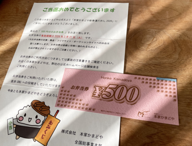 本家かまどやのX懸賞で「お弁当券500円分」が当選しました!