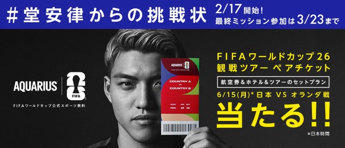 懸賞情報その場で当たるFIFAワールドカップ観戦ツアーやアクエリアス1本無料ドリンクチケットが当たる豪華懸賞 懸賞名:堂安律からの挑戦状 FIFAワールドカップ観戦ツアーチケットが当たる! キャンペーン当選賞品&当選人数:FIFAワールドカップ 26 観戦ツアー ペアチケット(5組10名様)FIFAワールドカップ26 公式試合球トリオンダ(7名様)アクエリアス1本無料 Coke ONドリンクチケット(合計11,000名様)応募条件:X(Twitter)アカウントで毎日その場で当たる企業名:コカ・コーラ この懸賞に応募する2026年03月23日(残り34日) 見逃せない懸賞ウエルシアで使える無料引換券5,000名様Amazonギフトカード 最大10,000円分毎月1,000名様Disneyのおしりふき毎月1名様デジタルポイント 最大10,000pt11,100名様えらべるPay 300円相当10,000名様カウネット オリジナル商品毎月50名様 応募可能な懸賞関連する当選報告 ディズニー貸切チケットやギフトカードも当たる講談社の春のマンガまつり2025キャンペーン残り84日総額100万円相当のPayPayポイントが当たる毎日応募X懸賞残り4日宝塚歌劇ペアチケットが当たる日清のクローズドキャンペーン残り14日【マツキヨココカラ&カンパニー×サンスター】西山智樹のサイン入りチェキが当たるキャンペーン残り18日オリジナルまけんグッズが当たるハガキキャンペーン残り42日毎月抽選!JTBトラベルギフト35,000円分が当たるクローズドキャンペーン2026年04月26日(毎月抽選) P&Gのハガキ懸賞で「ダスキン おそうじギフトカード 10,000円分」が当選しました!月刊cheek プレゼントキャンペーンBoome「ハーゲンダッツギフト券 2枚が抽選で当たる!キャンペーン」花王「カチコチ肩こり、疲れにバブ! 1週間体感キャンペーン」スギ薬局×ユニリーバのハガキ懸賞で「中日ドラゴンズ観戦ペアチケット」が当選しました♪ゴンチャのTwitter懸賞で「QUOカード3万円分」が当選しました☆ 関連情報: X懸賞(Twitter懸賞)オープン懸賞毎日応募ネット懸賞その場で当たるイベント・エンタメチケット・招待券大量当選無料クーポン・引換券SNS懸賞狙い目・穴場懸賞遊園地・テーマパーク・イベント懸賞情報 高額賞品・高級品ドリンク・飲料特別な体験|夢の実現CokeON招待券・入場券・チケットクーポン・無料券コカ・コーラ HOME懸賞情報応募方法SNS懸賞X懸賞(Twitter懸賞)FIFAワールドカップ観戦ツアーやアクエリアス1本無料ドリンクチケットが当たる豪華懸賞 2026年02月17日 更新:ものりんず@懸賞主婦【厳選】毎日応募 【全て】毎日応募 年末年始懸賞