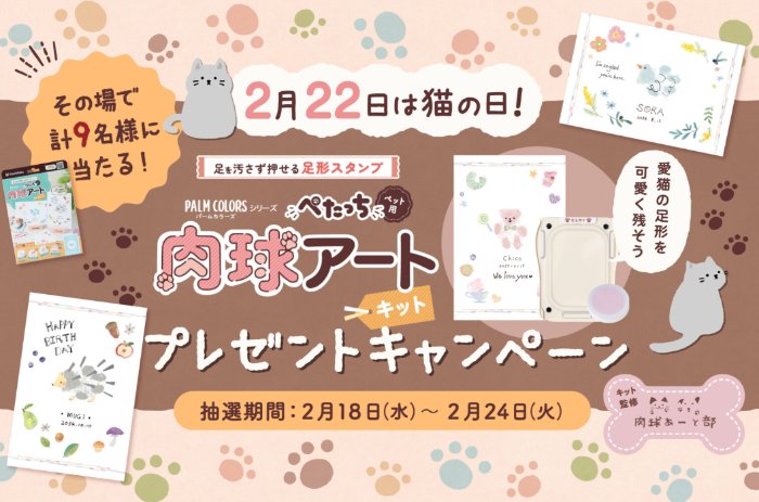 懸賞情報その場で当たる足形が取りやすい「ぺたっち ペット用 肉球アートキット」が当たるキャンペーン 懸賞名:2月22日は猫の日!肉球アートキットプレゼントキャンペーン当選賞品:ぺたっち ペット用 肉球アートキット当選人数:9名様応募条件:会員登録して応募企業名:シヤチハタ この懸賞に応募する2026年02月24日(残り4日) 見逃せない懸賞『生梅飴』の”なか”合計1,500名様PayPayポイント 2,026ポイント500名様JTBトラベルギフト 35,000円分毎月35名様ウエルシアで使える無料引換券5,000名様プレミアムポイント 最大10,000ポイント毎月80,101名様コズレオリジナルデザイン「出生届」メルマガ登録して必ずもらえる 応募可能な懸賞関連する当選報告 ちいかわオリジナルブックバンドペンケース&ペンが当たるキャンペーン残り23日先着当選!PayPayポイントが必ずもらえるカゴメのクローズドキャンペーン2026年03月02日17:00(先着25万名様に達し次第終了)グルメや図書カードネットギフトなども当たる書籍購入キャンペーン残り22日たべっ子どうぶつシリーズ商品1ヵ月分がもらえるぬりえコンテスト!毎月25日映画の試写会やオリジナルグッズなどが当たる会員限定キャンペーン!随時開催パンどろぼうのオリジナルサンドイッチケースが当たるレシート懸賞残り28日 Coca-Cola【発売前に緊急ミッション!『ジョージア ザ・プレミアム 微糖』が発売前に当たる!】キャンペーンBLOG monitor「Coyori 濃密美容クリーム」LIONのキャンペーンで「ソフラン 4本セット」が当選しました♪エリエールのTwitter懸賞で「旅行券3万円分」が当選しました☆Coca-Cola「ジョージアヨーロピアンセット」が当選しました☆コスモス×ユニリーバのレシート懸賞で「シロカ電気圧力鍋」が当選しました☆ 関連情報: オープン懸賞ネット懸賞その場で当たる懸賞情報文具・書籍・映像その他 シヤチハタ文具ペット・動物・生き物会員登録 HOME懸賞情報応募方法ネット懸賞足形が取りやすい「ぺたっち ペット用 肉球アートキット」が当たるキャンペーン 2026年02月18日 更新:ものりんず@懸賞主婦【厳選】毎日応募 【全て】毎日応募 年末年始懸賞