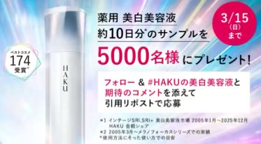 懸賞情報無料サンプル資生堂 HAKUの薬用 美白美容液がサンプルでお試しできるキャンペーン 懸賞名:薬用 美白美容液の約10日分のサンプルプレゼント当選賞品:HAKU 薬用 美白美容液サンプル当選人数:5,000名様応募条件:X(Twitter)アカウントで応募企業名:資生堂 この懸賞に応募する2026年03月15日(残り23日) 見逃せない懸賞東京ディズニーシー 貸し切りパーティー招待 / ディズニーリゾート パークチケット4,000組8,000名様 / 1,500組3,000名様大人気アイテムや豪華体験 / ツルハポイント or WAON POINT 1,000ポイント1,100名様 / 5,000名様無料で試せる「ベビー用スキンケア」のお得情報♪QUOカードPay 最大3,000円分1,450名様リポビタンファイン 10本セット50名様コズレオリジナルデザイン「出生届」メルマガ登録して必ずもらえる 応募可能な懸賞関連する当選報告 マックカードが100名様に当たる学研のえほんずかんキャンペーン残り39日【ジョイフル】500円分のデジタル食事券が500名様に当たるアプリキャンペーン残り11日ウエルシアグループで使える無料引換券が当たる大量当選キャンペーン残り7日パンダちゃん抱きまくらが当たる永谷園のハガキキャンペーン残り22日アスタリフトBBクリーム無料サンプルセットがお得に試せる!締切日不明DEZERTの幕張メッセ公演チケットやサイン入りグッズが当たるカラオケDAMのキャンペーン残り3日 井村屋「ボールアイスキャラクター 名前募集キャンペーン」マイレピの懸賞で「P&G製品の詰め合わせ」が当選しました☆DyDoのキャンペーンで「ぷるっシュ!!ゼリー×スパークリング6本セット」が当選しました☆PLANT×キリンのハガキ懸賞で「伊勢赤どり味噌漬け」が当選しました!カリフォルニア くるみ協会「くるみ大収穫祭」過去最高額「100万円分のAmazonギフト券」がIG証券の懸賞で当選!! 関連情報: X懸賞(Twitter懸賞)オープン懸賞ネット懸賞無料サンプル・試供品大量当選SNS懸賞美容・健康・コスメ懸賞情報 スキンケア化粧品・コスメ資生堂 HOME懸賞情報応募方法SNS懸賞X懸賞(Twitter懸賞)資生堂 HAKUの薬用 美白美容液がサンプルでお試しできるキャンペーン 2026年02月20日 更新:ものりんず@懸賞主婦【厳選】毎日応募 【全て】毎日応募 年末年始懸賞