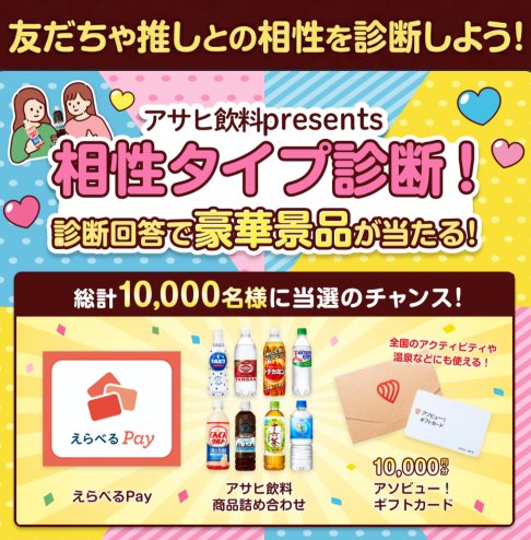 懸賞情報10,000名様にアソビュー!ギフトやアサヒ飲料セットも当たるLINEキャンペーン 懸賞名:相性タイプ診断!当選賞品&当選人数:えらべるPay 50円分(9,690名様)アサヒ飲料セット(300名様)アソビュー!ギフトカード 10,000円分(10名様)応募条件:LINEアカウントで応募企業名:アサヒ飲料 この懸賞に応募する2026年03月13日(残り21日) 見逃せない懸賞えらべるPay 最大3万円分合計1,005名様ごめんね素肌 化粧水・乳液 サンプル1万名様サイベックス ミオス ベビーカー / 洗えるベビー布団セット / パナソニック 電動自転車 他1名様 / 3名様 / 1名様 他ミノン 日焼け止めサンプル15,000名様星野リゾート宿泊ギフト 50,000円分 / サンドラッグポイント 1,000pt / ライオン対象商品引換クーポン100名様 / 2,500名様 / 3,000名様しまじろうグッズ / JCBギフトカード 1,000円分合計200名様 / 400名様 応募可能な懸賞関連する当選報告 宝塚歌劇 貸切公演チケットが当たるベルーナのクローズドキャンペーン(本日最終日!!)全プレ☆万田酵素が無料でお試しできるお得なキャンペーン!締切日不明毎月開催♪ニチレイ商品の詰め合わせが当たるキャンペーン毎月応募可能えらべるPay1,000円分がその場で100名様に当たるXキャンペーン残り8日ハウステンボス1DAYパス付きホテル宿泊券も当たるユースキン製薬の豪華懸賞2026年03月31日(全4回開催)毎月開催!カルビーのお菓子が当たるLINEプレゼントキャンペーン毎月開催 ココ・カラ。和歌山「旬の特産品プレゼントキャンペーン」crocos「コカ・コーラ ゼロ プレゼントキャンペーン」「キッザニア招待券」がNISSEIのキャンペーンで当選しました♪ローソンのキャンペーンで「東京ディズニーリゾート35周年クッション」が当選しました!LION「キレイキレイ薬用キッチン泡ハンドソープ」が当選しました♪明光義塾「塾講師に関するアンケート」 関連情報: オープン懸賞LINE懸賞ネット懸賞豪華・高額懸賞現金・金券・ギフト券大量当選SNS懸賞食品・飲料狙い目・穴場懸賞懸賞情報 詰め合わせ・セット高額賞品・高級品商品券・ギフト券・金券ドリンク・飲料電子マネー・ポイントお茶・紅茶Asahi|アサヒ HOME懸賞情報応募方法SNS懸賞LINE懸賞10,000名様にアソビュー!ギフトやアサヒ飲料セットも当たるLINEキャンペーン 2026年02月20日 更新:ものりんず@懸賞主婦【厳選】毎日応募 【全て】毎日応募 年末年始懸賞