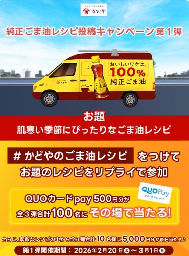 懸賞情報その場で当たるQUOカードPay500円分がその場で当たるレシピ投稿キャンペーン 懸賞名:純正ごま油レシピ投稿キャンペーン当選賞品:QUOカードPay 500円分当選人数:100名様応募条件:X(Twitter)アカウントで毎日その場で当たる企業名:かどや製油 この懸賞に応募する2026年03月01日(残り9日) 見逃せない懸賞QUOカードPay 2,000円分各回50名様QUOカード 3,000円分1,000名様カタログギフト / Amazonギフトカード 500円分5名様 / 50名様ハローキティぬいぐるみ / グルメカタログギフト / えらべるPay 500円相当10,000名様 / 6,000名様 / 2,000名様ディズニーシー貸切パーティー招待券4,000組8,000名様ベビーカー / 抱っこ紐 / ベビーベッド / Amazonギフト 10,000円分 他1名様 / 1名様 / 1名様 / 3名様 他 応募可能な懸賞関連する当選報告 2,000円分のAmazonギフトカードが当たるエスビー食品レシート懸賞残り4日15,000名様に当たるPascoの春フェスキャンペーン2026年05月07日(全2回開催)スギ薬局グループ専用QUOカードPayが当たるぬりえ投稿キャンペーン残り9日入園無料招待券やグルメなども当たるJAF会員限定プレゼントキャンペーン賞品によって異なりますニベアのクリームケアボディウォッシュがお試しできる商品モニター懸賞残り3日【遠鉄ストア×テレビ静岡】明治工場見学&いちご狩り親子バスツアーも当たるキャンペーン残り9日 ロッテのキャンペーンで「お菓子包み」が当選しました♪マックスバリュ中部&コーミの懸賞で「デザートブッフェ券」が当選しました♪ハインツのハガキ懸賞で「ハインツ詰め合わせ」が当選しました!メーカー各社主催のハガキ懸賞で「家庭用品詰め合わせ」が当選しました☆Suntory「琥珀の金麦」が当選しました♪asahi「食事と一緒に十六茶W リニューアル記念!発売前に2,000名様にお届けキャンペーン」 関連情報: X懸賞(Twitter懸賞)オープン懸賞毎日応募ネット懸賞その場で当たる現金・金券・ギフト券SNS懸賞懸賞情報 電子マネー・ポイント料理・レシピ投稿QUOカードPay HOME懸賞情報応募方法SNS懸賞X懸賞(Twitter懸賞)QUOカードPay500円分がその場で当たるレシピ投稿キャンペーン 2026年02月20日 更新:ものりんず@懸賞主婦【厳選】毎日応募 【全て】毎日応募 年末年始懸賞
