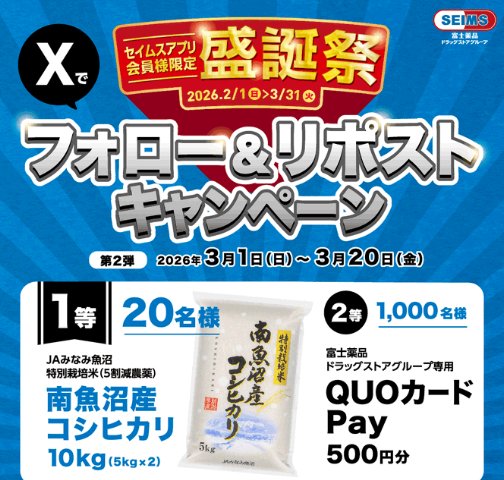懸賞情報その場で当たる南魚沼産コシヒカリや専用QUOカードPayがその場で当たるXキャンペーン 懸賞名:セイムスアプリ盛誕祭当選賞品&当選人数:南魚沼産コシヒカリ 10kg(20名様)専用QUOカードPay 500円分(1,000名様)応募条件:X(Twitter)アカウントで毎日その場で当たる企業名:セイムス この懸賞に応募する2026年03月20日(残り18日) 見逃せない懸賞東京ディズニーシー貸切チケット+ホテル宿泊券 他50組100名様 他Jリーグ観戦チケット合計150,000名様Dyson コードレス掃除機 / 電動アシスト自転車 / combi ベビーカー 他1名様 / 1名様 / 1名様 他えらべるPay 最大5万円分1,000名様えらべるPay 500円分 or ミニチュアチャーム1,000名様Disneyのおしりふき毎月1名様 応募可能な懸賞関連する当選報告 Omoinotake コラボQUOカードが当たるブルボンのクローズドキャンペーン残り13日Androidスマートフォン「Galaxy S26 Ultra」とGalaxy Buds4 Proが1名様に当たる豪華懸賞(本日最終日!!)新色カラートリートメントが当たるレシートキャンペーン毎月末日(応募数が10通を下回った場合はキャンペーン終了)Amazonギフトカード500円分が50名様にその場で当たるXキャンペーン残り7日ザ・コラーゲン3本セットが500名様にその場で当たるXキャンペーン残り2日全プレ!ゆず油 ヘアオイル or オイルミストがもらえるハガキ懸賞締切日不明 サントリーのキャンペーンで「現金1万円」が当選しました☆和光堂のTwitter懸賞で「朝ごはんセット」が当選しました☆オークワ×日清のハガキ懸賞で「日清食品詰め合わせ」が当選しました♪ミツカンのInstagram懸賞で「ポン酢4種セット」が当選しました!コノミヤのクローズド懸賞で「お楽しみセット」が当選しました!トラストナビ「みせ特プレゼント8月・9月号 ゆずすこ&ゆずあ〜るセット」 関連情報: X懸賞(Twitter懸賞)オープン懸賞毎日応募その場で当たるネット懸賞現金・金券・ギフト券大量当選SNS懸賞食品・飲料懸賞情報 食品・グルメ電子マネー・ポイントお米QUOカードPay HOME懸賞情報応募方法SNS懸賞X懸賞(Twitter懸賞)南魚沼産コシヒカリや専用QUOカードPayがその場で当たるXキャンペーン 2026年03月02日 更新:ものりんず@懸賞主婦【厳選】毎日応募 【全て】毎日応募