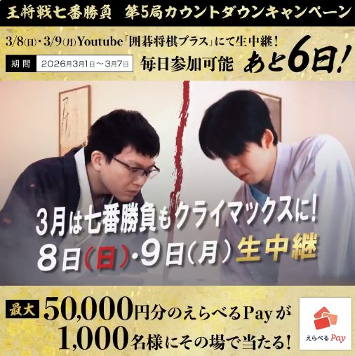 懸賞情報その場で当たる1,000名様に最大5万円分のえらべるPayがその場で当たるX懸賞 懸賞名:カウントダウンキャンペーン当選賞品:えらべるPay 最大5万円分当選人数:1,000名様応募条件:X(Twitter)アカウントで毎日その場で当たる企業名:囲碁将棋プラス この懸賞に応募する2026年03月07日(残り5日) 見逃せない懸賞『生梅飴』の”なか”合計1,500名様JCBギフトカード 3,000円分 / クッション / CIAO缶シリーズ 1ケース1,000名様 / 応募券を集めて必ずもらえる / 応募券を集めて必ずもらえるDyson コードレス掃除機 / 電動アシスト自転車 / combi ベビーカー 他1名様 / 1名様 / 1名様 他電動アシスト自転車 / Dyson 空気清浄ファンヒーター / カタログギフト 他5名様 / 30名様 / 70名様 他ナルミヤキャラクターズ限定グッズ1,100名様パンパース オムツ毎月1名様 応募可能な懸賞関連する当選報告 giftee Boxが当たる日立の新規会員登録キャンペーン!締切日不明毎月応募OK!サンスター製品が当たる会員限定キャンペーン毎月末日クラシエ商品詰め合わせが当たる会員限定キャンペーン!(本日最終日!!)総額20万円の「くら寿司」お食事券が当たるX懸賞不定期開催毎月開催☆オリジナルグッズや生活雑貨が当たる会員限定キャンペーン毎月末日毎月開催♪口腔ケアグッズが当たるSNSキャンペーン毎月開催 @cosme「IOPE(アイオペ)プレゼント企画」buzzLife「奇跡!?の198kcalを体験 第2弾(日清食品)プロジェクト」に参加決定!ヤマナカ・S&Bのハガキ懸賞で「商品券2,000円分」が当選しました☆せとうちファンクラブのTwitter懸賞で「特選やきあなご」が当選しました!フィール&寿がきやのハガキ懸賞で「プレミアムSugakiyaラーメン」が当選しました☆KOSE「アスタブランのサンプルセット」が当選しました☆ 関連情報: X懸賞(Twitter懸賞)オープン懸賞毎日応募その場で当たるネット懸賞豪華・高額懸賞現金・金券・ギフト券大量当選SNS懸賞懸賞情報 高額賞品・高級品電子マネー・ポイント HOME懸賞情報応募方法SNS懸賞X懸賞(Twitter懸賞)1,000名様に最大5万円分のえらべるPayがその場で当たるX懸賞 2026年03月02日 更新:ものりんず@懸賞主婦【厳選】毎日応募 【全て】毎日応募