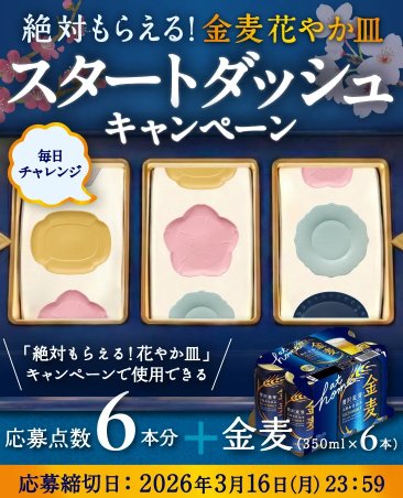 懸賞情報その場で当たるサントリー金麦+応募点数6本分がその場で当たるLINEキャンペーン 懸賞名:「絶対もらえる!金麦花やか皿」スタートダッシュキャンペーン当選賞品:サントリー金麦+応募点数6本分当選人数:1,000名様応募条件:LINEアカウントで応募企業名:サントリー この懸賞に応募する2026年03月16日(残り13日) 見逃せない懸賞QUOカードPay 最大1万円分合計10,000名様現金 最大1万円 / デジタルポイント 30pt1,000名様 / 対象商品を購入して必ずもらえるサイベックス ミオス ベビーカー / 洗えるベビー布団セット / パナソニック 電動自転車 他1名様 / 3名様 / 1名様 他ムッシュ熊雄ヨギボー / キャンバスミニトート20名様 / 980名様明治ポイント 200pt各月2,000名様はじめてのベビースタイ応募者全員 応募可能な懸賞関連する当選報告 【定期開催】豪華家電が当たる!ヨドバシカメラ梅田店のX懸賞不定期開催ビーンスターク商品がお試しできるサンプルプレゼントキャンペーン毎月開催シナぷしゅコラボグッズが当たる森永のレシートキャンペーン2026年05月15日(全2回開催)【LINE懸賞】毎月開催!プレミアムQUOカードが当たるプレゼントキャンペーン♪毎月開催デニーズオリジナル食品ブランド『Denny’s Table』セットが当たるキャンペーン締切日不明先着で10万名様にコラージュフルフルサンプルセットが当たるキャンペーン残り17日 UCCのハガキ懸賞で「体験ギフトカタログ」が当選しました♪Yストア×味の素のハガキ懸賞で「クリスマスケーキ」が当選しました!バンダイのハガキ懸賞で「アンパンマンおかたづけBOX」が当選しました☆花王のクローズド懸賞で「ビオレ商品詰め合わせ」が当選しました!オークワ×クラシエのハガキ懸賞で「北海道クリームブリュレ」が当選しました!KIRIN「キリン メッツ オリジナルQUOカード」が当選しました♪ 関連情報: オープン懸賞LINE懸賞毎日応募ネット懸賞その場で当たる大量当選SNS懸賞食品・飲料懸賞情報 お酒サントリー HOME懸賞情報応募方法SNS懸賞LINE懸賞サントリー金麦+応募点数6本分がその場で当たるLINEキャンペーン 2026年03月03日 更新:ものりんず@懸賞主婦【厳選】毎日応募 【全て】毎日応募