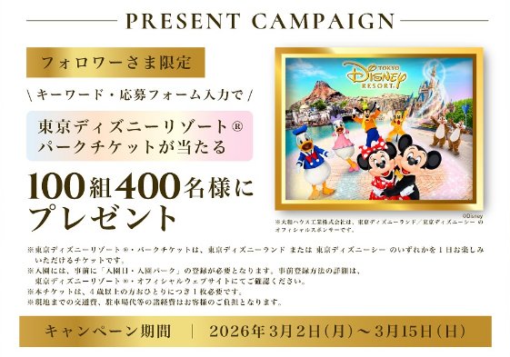 懸賞情報ディズニーリゾート・パークチケットが当たる大和ハウスのInstagramキャンペーン 懸賞名:PRESENT CAMPAIGN当選賞品:ディズニーリゾート・パークチケット当選人数:100組400名様応募条件:Instagramアカウントで応募企業名:大和ハウス この懸賞に応募する2026年03月15日(残り11日) 見逃せない懸賞イトメン製品&オリジナルレシピブック各回500名様富士薬品ドラッグストアグループ専用QUOカードPay3,000名様はじめてのベビースタイ応募者全員今田美桜直筆サイン入りウイスキー 陸 / 限定タンブラー+ウイスキー 陸 / QUOカード 500円分10名様 / 500名様 / 500名様あなただけのグリーンラベル オリジナル缶5,000名様ベルメゾンのおすすめ商品(毎週変動)賞品によって異なります 応募可能な懸賞関連する当選報告 全プレ☆スキンチェックでオルビス無料サンプルがもらえるキャンペーン!常時開催中カプセル式コーヒー&ティーマシンがお試しできるモニター募集キャンペーン残り4日毎日7名様に純金1gが当たるセブン-イレブンの豪華アプリ懸賞残り27日上がるブラキャミがお試しできるファンケルの商品モニター懸賞残り12日ヨーグルトセットや万能包丁セットも当たるハガキキャンペーン残り31日FIFAワールドカップ観戦ツアーやアクエリアス1本無料ドリンクチケットが当たる豪華懸賞残り19日 KAGOME「野菜生活100 国産プレミアムセット」が当選しました♪イオン×アサヒのクローズド懸賞で「カルピスギフト」が当選しました!コクヨのTwitter懸賞で「一愼 鰻のひつまぶし」が当選しました☆Yストア・伊藤ハムのハガキ懸賞で「グランドゴールド」の無料引換券が当選しました♪KAGOME「カゴメ夏のプレミアム 先行体験キャンペーン」に当選しました♪オークワ×クラシエのハガキ懸賞で「北海道クリームブリュレ」が当選しました! 関連情報: ディズニー懸賞オープン懸賞ネット懸賞Instagram懸賞豪華・高額懸賞チケット・招待券SNS懸賞遊園地・テーマパーク・イベント懸賞情報 テーマパーク・レジャースポット東京高額賞品・高級品関東(茨城・栃木・群馬・埼玉・千葉・東京・神奈川)特別な体験|夢の実現招待券・入場券・チケットDisney|ディズニー HOME懸賞情報ジャンル遊園地・テーマパーク・イベントディズニー懸賞ディズニーリゾート・パークチケットが当たる大和ハウスのInstagramキャンペーン 2026年03月04日 更新:ものりんず@懸賞主婦【厳選】毎日応募 【全て】毎日応募