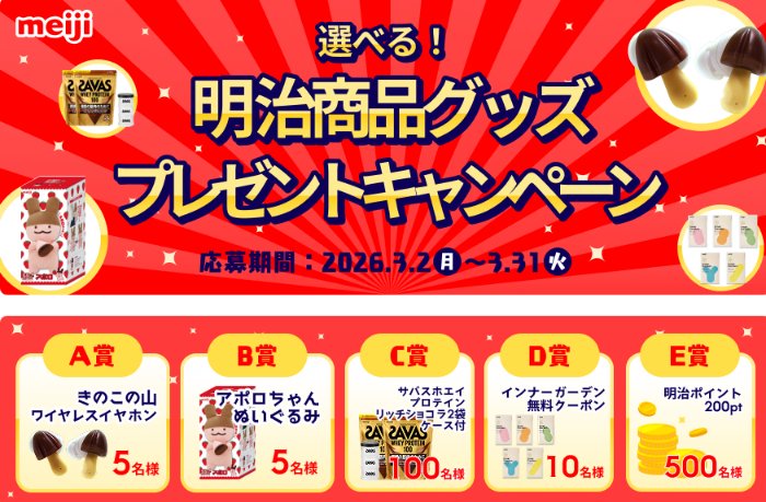 懸賞情報明治商品グッズが当たる会員限定プレゼントキャンペーン 懸賞名:選べる!明治商品グッズプレゼントキャンペーン当選賞品:明治商品グッズ当選人数:620名様応募条件:会員登録して応募企業名:明治 この懸賞に応募する2026年03月31日(残り12日) 見逃せない懸賞PayPayポイント 3,000円相当1,000名様キレキラ!ワイパー ドライ×ウェットシート無料引き換えクーポン5,000名様JTBトラベルポイント 最大30万ポイント411名様オリジナルQUOカード 500円分2,000名様キッザニア東京・キッザニア福岡 招待券175組350名様オリジナル名入れ絵本ダウンロードデータ対象者全員 応募可能な懸賞関連する当選報告 合計150,000名様にJリーグ観戦チケットが当たる豪華キャンペーン2026年03月24日(試合によって異なります)ダリヤ商品の詰め合わせが当たる白髪川柳投稿キャンペーン!毎月開催マックカードが100名様に当たる学研のえほんずかんキャンペーン残り12日えらべるPay3,000円分がその場で当たるXキャンペーン(本日最終日!!)グルメやコスメなどが当たる豪華会員限定キャンペーン!賞品によって異なります5,000円分のディズニーリゾート・ギフトカードも当たる「ディズニーファン」定期購読キャンペーン2027年03月15日(全2回抽選) 西友×明治のハガキ懸賞で「豪華カタログギフト2冊」が当選しました!LINEマンガのTwitter懸賞で「映画鑑賞券」が当選しました♪日本郵便のTwitter懸賞で「季節のフラワーアレンジメント」が当選しました♪KIRIN「BITTERS エクストラビター 先行モニターキャンペーン」オークワ×日清のハガキ懸賞で「日清食品詰め合わせ」が当選しました♪MONIPLA「簡単クイズに答えて【ふとんクリーナーレイコップRS】が当たる♪快適健康生活を始めようキャンペーン」 関連情報: オープン懸賞ネット懸賞家電・デジタル機器豪華・高額懸賞現金・金券・ギフト券無料クーポン・引換券懸賞情報 アニメ・キャラクター電子マネー・ポイントおもちゃ・ぬいぐるみクーポン・無料券会員登録デジタル家電・AV機器イヤホン・スピーカー・音響meiji|明治 HOME懸賞情報応募方法ネット懸賞明治商品グッズが当たる会員限定プレゼントキャンペーン 2026年03月16日 更新:ものりんず@懸賞主婦【厳選】毎日応募 【全て】毎日応募