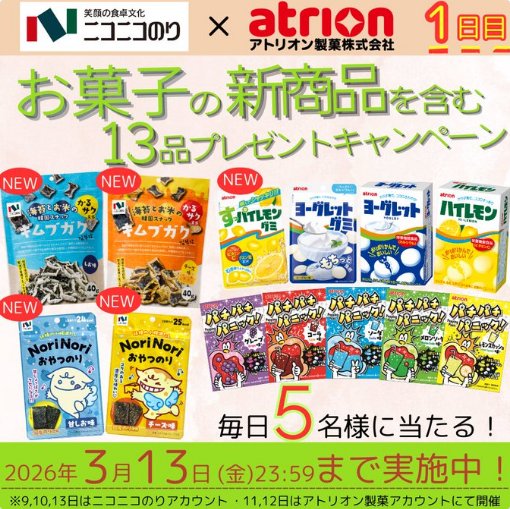 懸賞情報お菓子の詰め合わせが当たる毎日応募Xキャンペーン 懸賞名:お菓子の詰合わせプレゼントキャンペーン当選賞品:お菓子の詰め合わせ当選人数:毎日5名様応募条件:X(Twitter)アカウントで毎日応募企業名:アトリオン製菓×ニコニコのりニコニコのり アカウント2026年03月13日(残り3日)アトリオン製菓 アカウント2026年03月13日(残り3日) 見逃せない懸賞メラノショット P×セラムヴェール ディープリペア サンプル10,000名様東京ディズニーシー 貸し切りパーティー招待 / ディズニーリゾート パークチケット4,000組8,000名様 / 1,500組3,000名様ベビーカー / 抱っこ紐 / ベビーベッド / Amazonギフト 10,000円分 他1名様 / 1名様 / 1名様 / 3名様 他葬送のフリーレングッズ、えらべるPay など賞品によって異なります電動アシスト自転車 / Dyson 空気清浄ファンヒーター / カタログギフト 他5名様 / 30名様 / 70名様 他Amazonギフト券 10,000円分 / ジェラートピケ ママバッグ3名様 / 1名様 応募可能な懸賞関連する当選報告 USJやりすぎセットが当たるユニバの写真投稿キャンペーン残り82日低刺激性スキンケアNOV(ノブ)の無料サンプルセットがもらえるキャンペーン☆定期開催アテント下着爽快・下着気分の 紙パンツがお試しできるキャンペーン残り21日図書カードNEXT1,000円分が当たる文理のクローズドキャンペーン残り21日ディズニーパークチケットやパークグッズが当たる豪華雑誌限定キャンペーン♪毎月開催【オークワ×伊藤ハム】USJ 1デイ・スタジオ・パスが当たる豪華レシートキャンペーン残り13日 イーアイデムのTwitter懸賞で「Amazonギフト券 5,000円分」が当選しました☆ポチカム「クオリティファースト シートマスク詰め合わせ」が当選しました!REGZAのTwitter懸賞で「一休.comギフトクーポン10,000円分」が当選しました!ROSETTE「2016年春夏新商品 ロゼット洗顔パスタ ホワイトダイヤ モニター」「キッザニア招待券」がNISSEIのキャンペーンで当選しました♪マツモトキヨシ&花王のキャンペーンで「コンパクトホットプレート」が当選しました♪ 関連情報: X懸賞(Twitter懸賞)オープン懸賞毎日応募ネット懸賞SNS懸賞食品・飲料懸賞情報 詰め合わせ・セットお菓子・スイーツ・デザート HOME懸賞情報応募方法SNS懸賞X懸賞(Twitter懸賞)お菓子の詰め合わせが当たる毎日応募Xキャンペーン 2026年03月09日 更新:ものりんず@懸賞主婦【厳選】毎日応募 【全て】毎日応募