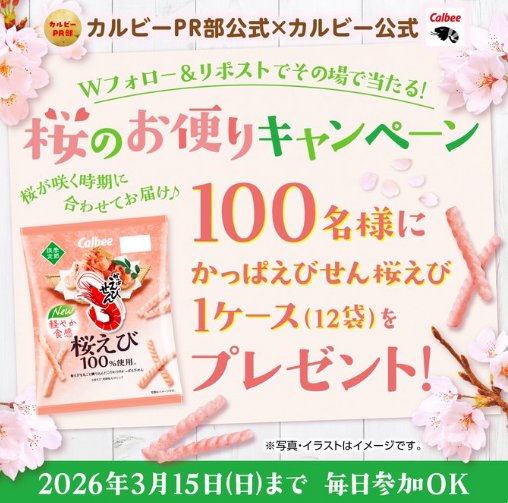 懸賞情報その場で当たるかっぱえびせん桜えび 1ケースが当たる毎日応募Xキャンペーン 懸賞名:桜のお便りキャンペーン当選賞品:かっぱえびせん桜えび 1ケース当選人数:100名様応募条件:X(Twitter)アカウントで毎日その場で当たる企業名:カルビー この懸賞に応募する2026年03月15日(残り6日) 見逃せない懸賞最大8,888Pontaポイント1,400名様美容液ファンデ&UV下地サンプル10,000名様マタニティ・ベビー用品・コスメなどのサンプルセット賞品によって異なる釣りグミBIGぬいぐるみ5,500名様現金 50万円 / 人気家電セット / 丸美屋商品詰め合わせ10名様 / 10名様 / 10,000名様日本旅行で使えるクーポン対象者全員 応募可能な懸賞関連する当選報告 毎月抽選!選べるギフトが当たる、三井住友海上あいおい生命のアンケート懸賞毎月末日総額100万円の図書カードネットギフトが当たるキャンペーン残り22日ディズニー貸切招待券やプリマハム商品詰め合わせも当たる豪華ハガキ懸賞2026年04月03日(全2回開催)新型トナーレプレスイベント招待も当たるAlfa Romeoの豪華キャンペーン2026年03月17日(賞品によって異なります)バースデー花束が当日届く素敵なキャンペーン♪毎日0:00~10:00のみ開催五等分の花嫁*コラボグッズなどが当たるレシートキャンペーン2026年05月08日(全2回開催) カルビー×森永のハガキ懸賞で「フルーツジャム 4個セット」が当選しました!サントリー「ROLLING HOP」モニターが当選しました!コンビニ引き換えキャンペーンの当選ラッシュです☆不二家「LOOK Carre 公式アンバサダー」に認定されました☆FEEL×プリマハム×Suntory「ザ・プレミアム・モルツ マスターズドリーム12本セット」が当選しました♪東芝のTwitter懸賞で「Bluetooth ヘッドホン」が当選しました! 関連情報: X懸賞(Twitter懸賞)オープン懸賞毎日応募その場で当たるネット懸賞SNS懸賞食品・飲料懸賞情報 お菓子・スイーツ・デザートカルビー HOME懸賞情報応募方法SNS懸賞X懸賞(Twitter懸賞)かっぱえびせん桜えび 1ケースが当たる毎日応募Xキャンペーン 2026年03月09日 更新:ものりんず@懸賞主婦【厳選】毎日応募 【全て】毎日応募