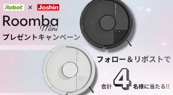懸賞情報その場で当たるRoomba Miniがその場で4名様に当たるジョーシンの豪華X懸賞 懸賞名:Roomba Mini 発売記念プレゼントキャンペーン当選賞品:Roomba Mini当選人数:4名様応募条件:X(Twitter)アカウントでその場で当たる企業名:ジョーシン この懸賞に応募する2026年05月10日(残り13日) 見逃せない懸賞PayPayポイント 3,000円相当1,000名様東京ディズニーシー貸切チケット+ホテル宿泊券 他50組100名様 他こどもちゃれんじ資料&年齢別体験セット応募者全員オリジナルQUOカード 最大10,000円分3,500名様Biore UV×StrayKidsコラボ限定グッズ2,500名様コズレオリジナルデザイン「出生届」メルマガ登録して必ずもらえる 応募可能な懸賞関連する当選報告 【いなげや×赤城乳業】赤城乳業商品を食べて ガリガリ君に会いに行っちゃおう!キャンペーン残り34日京都 たち吉謹製 京皿セットが当たるサントリーのクローズドキャンペーン残り13日キッチンアイテムや生活雑貨などが当たるダスキンの会員限定キャンペーン賞品によって異なります10万円分のソニーポイントが当たる豪華会員限定キャンペーン残り4日デジコポイント1,000円分が当たる東京シティ競馬のレース予想キャンペーン2027年03月26日(大井競馬開催日 各日)毎月10,000名様!グ~ンのおむつがサンプルでお試しできるキャンペーン毎月末日 DyDoのキャンペーンで「ぷるっシュ!!ゼリー×スパークリング6本セット」が当選しました☆伊藤園「TEAS’ TEA キャンペーン」ダイショーのハガキ懸賞で「オリジナルもつ鍋セット」が当選しました☆KAGOME「野菜生活100 国産プレミアムセット」が当選しました♪ライフラインスキンケアのTwitter懸賞で「プレミアムミニコレクション」が当選しました☆KIRIN「星のカービィ ロボボプラネット」が当選しました♪ 関連情報: X懸賞(Twitter懸賞)オープン懸賞その場で当たるネット懸賞家電・デジタル機器豪華・高額懸賞SNS懸賞懸賞情報 高額賞品・高級品ロボット掃除機生活家電ルンバ HOME懸賞情報応募方法SNS懸賞X懸賞(Twitter懸賞)Roomba Miniがその場で4名様に当たるジョーシンの豪華X懸賞 2026年04月27日 更新:ものりんず@懸賞主婦【厳選】毎日応募 【全て】毎日応募