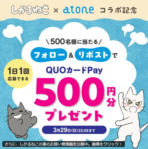 懸賞情報その場で当たるしかるねこオリジナルQUOカードPayがその場で当たるXキャンペーン 懸賞名:しかるねこ×atone 春のお買い物キャンペーン当選賞品:オリジナルQUOカードPay 500円分当選人数:500名様応募条件:X(Twitter)アカウントで毎日その場で当たる企業名:atone この懸賞に応募する2026年03月29日(残り13日) 見逃せない懸賞東京ディズニーシー貸切チケット+ホテル宿泊券 他50組100名様 他QUOカードPay 2,000円分各回50名様JTBトラベルギフト 5,000円分80名様えらべるPay 最大3,000ポイント1,055名様えらべるPay 最大10,000円分 / オリジナルグッズ / コミック全巻セット毎日200名様PlayStation 53名様 応募可能な懸賞関連する当選報告 【LINE懸賞】3,000円相当のベルーナグルメ商品が当たるキャンペーン!毎月開催毎月開催!花王製品が当たる、新規会員登録キャンペーン毎月開催ファンケルの無添加ポイントメイクがお試しできる商品モニターキャンペーン(本日最終日!!)ディズニーランド・1デーパスポート+パレード優先鑑賞席チケットも当たる豪華懸賞終了日未定最大25,000円のキャッシュバック!シャープのお得なキャンペーン残り35日10,000円分のAmazonギフトカードがその場で当たる豪華X懸賞残り1日 アサヒ飲料のハガキ懸賞で「アミールSと新商品のセット」が当選しました!KIRIN「発売前の新フレーバー、飲めちゃいます。バタフライ『イチパッとつぶやこう!』キャンペーン」新日本スーパーマーケット同盟×日清のハガキ懸賞で「どん兵衛食べ比べセット」が当選しました♪ニチバンのハガキ懸賞で「ベイクドチーズケーキ&ショコラノワール」が当選しました!マックスバリュ東海×おやつカンパニーのハガキ懸賞で「お菓子詰め合わせ」が当選しました☆コノミヤ×日清のハガキ懸賞で「クリスマスケーキ」が当選しました☆ 関連情報: X懸賞(Twitter懸賞)オープン懸賞毎日応募ネット懸賞その場で当たる現金・金券・ギフト券SNS懸賞懸賞情報 電子マネー・ポイントQUOカードPay HOME懸賞情報応募方法SNS懸賞X懸賞(Twitter懸賞)しかるねこオリジナルQUOカードPayがその場で当たるXキャンペーン 2026年03月16日 更新:ものりんず@懸賞主婦【厳選】毎日応募 【全て】毎日応募