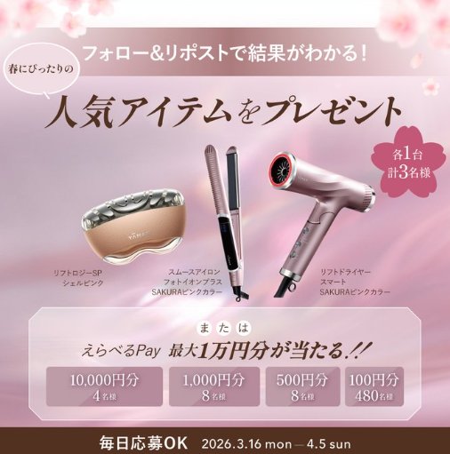 懸賞情報その場で当たる春にピッタリの人気アイテムが当たるヤーマンの豪華X懸賞 懸賞名:新生活応援キャンペーン当選賞品&当選人数:美顔器リフトロジー(1名様)スムースアイロン(1名様)リフトドライヤー(1名様)えらべるPay 最大1万円分(合計500名様)応募条件:X(Twitter)アカウントで毎日その場で当たる企業名:ヤーマン この懸賞に応募する2026年04月05日(残り20日) 見逃せない懸賞本麒麟 コンビニ無料引換クーポン18.5万名様テンスター カラーシャンプー無料サンプル対象者全員ベビーカー / 抱っこ紐 / ベビーベッド / Amazonギフト 10,000円分 他1名様 / 1名様 / 1名様 / 3名様 他メタルスライムグッズ 7点セット7名様象印 電気ケトル / アラジン グラファイトトースター / カタログギフト 他30名様 / 30名様 / 合計80名様 他Amazonギフトカード 1万円分50名様 応募可能な懸賞関連する当選報告 シナぷしゅコラボグッズが当たる森永のレシートキャンペーン2026年05月15日(全2回開催)最大1,000ポイント分のLINEポイントがその場で当たるキャンペーン!締切日不明マルハニチロ新商品やモニター商品が当たるキャンペーン♪定期開催茨城の名産品が当たるクイズキャンペーン!定期開催すかいらーくグループの食事券がその場で当たるXキャンペーン残り2日カタログギフト&旅行券や家電も当たる明治の豪華キャンペーン2026年06月30日(全2回開催) Coca-Cola「ジョージアヨーロピアンセット」が当選しました☆@cosmeのキャンペーンで「バウンシア ボディソープ」が当選しました!Suntory「-196℃ストロングゼロ 飲み比べセット」が当選しました♪3Mのハガキ懸賞で「リストランテ・サバティーニ青山 アイスセット」が当選しました☆平和堂×東洋水産のハガキ懸賞で「ご当地カップ麺詰め合わせ」が当選しました!オハヨー乳業「新商品アイスクリーム BRULEE」の無料モニターに当選しました! 関連情報: X懸賞(Twitter懸賞)オープン懸賞毎日応募その場で当たるネット懸賞家電・デジタル機器豪華・高額懸賞現金・金券・ギフト券SNS懸賞懸賞情報 高額賞品・高級品電子マネー・ポイントヤーマン美容家電ドライヤー HOME懸賞情報応募方法SNS懸賞X懸賞(Twitter懸賞)春にピッタリの人気アイテムが当たるヤーマンの豪華X懸賞 2026年03月16日 更新:ものりんず@懸賞主婦【厳選】毎日応募 【全て】毎日応募