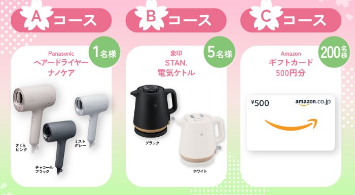 懸賞情報豪華家電やアマギフも当たるエイブルのLINEプレゼントキャンペーン 懸賞名:MAISON ABLE 新⽣活応援キャンペーン当選賞品&当選人数:Aコース:Panasonic ヘアドライヤー(1名様)Bコース:象印 電気ケトル(5名様)Cコース:Amazonギフトカード 500円分(200名様)応募条件:LINEアカウントで応募企業名:エイブル この懸賞に応募する2026年04月07日(残り12日) 見逃せない懸賞ギフトペイ 500pt / 国産焼鳥盛り合わせ / 焼肉ヒロミヤ味付き焼肉セット3,000名様 / 300名様 / 300名様QUOカードPay 最大2,500円分10,000名様マタニティ・ベビー用品・コスメなどのサンプルセット賞品によって異なるアラジン グラファイトトースター / レコルト 卓上IHクッキンググリドル 他50名様 / 50名様 他七味 2本セット各回500名様デジタルギフトカード 最大1万円分936名様 応募可能な懸賞関連する当選報告 【TSUTAYA対象店舗限定】『クジラがしんだら』図書カードが当たるクローズドキャンペーン2026年09月30日(全2回開催)セブンプレミアム ポテトチップスの引換券がその場で当たるInstagram懸賞残り5日【定期開催】豪華家電が当たる!ヨドバシカメラのX懸賞定期開催DEWのブライトバウンスミルクがサンプルでお試しできるキャンペーン残り20日【LINE懸賞】3,000円相当のベルーナグルメ商品が当たるキャンペーン!毎月開催全プレ!フレークシール素材が必ずもらえる無料会員登録キャンペーン!常時募集中 キッズステーション「図書カード 2,000円分」が当選しました☆コノミヤ×AGFのキャンペーンで「KANIEベーカリー 朝食パン大人気セット」が当選しました♪UCC「『2015 COFFEE DREAM キャンペーン』バロー・バローホームセンター・食鮮館タイヨー」アオキスーパー×一正蒲鉾のハガキ懸賞で「アオキスーパーのお買い物券 1,000円分」が当選しました!BLONET「skinvill ホットクレンジングジェル 」バロー・キリンのハガキ懸賞で「商品券 1,000円分」が当選しました☆ 関連情報: オープン懸賞LINE懸賞ネット懸賞家電・デジタル機器豪華・高額懸賞現金・金券・ギフト券SNS懸賞懸賞情報 高額賞品・高級品Amazonギフト券商品券・ギフト券・金券調理家電美容家電ドライヤーPanasonic|パナソニック象印 HOME懸賞情報応募方法SNS懸賞LINE懸賞豪華家電やアマギフも当たるエイブルのLINEプレゼントキャンペーン 2026年03月25日 更新:ものりんず@懸賞主婦【厳選】毎日応募 【全て】毎日応募