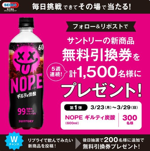 懸賞情報その場で当たるNOPE ギルティ炭酸の無料引換クーポンが当たる大量当選X懸賞 懸賞名:5週連続、サントリー新商品 計1,500名様に無料引換券プレゼント当選賞品:NOPE ギルティ炭酸 無料引換クーポン当選人数:300名様応募条件:X(Twitter)アカウントで毎日その場で当たる企業名:セイムス この懸賞に応募する2026年03月29日(残り4日) 見逃せない懸賞ジッパーバッグ / キーホルダー / QUOカード 500円分1,000名様 / 300名様 / 200名様Amazonギフトコード 500円分1,000名様ベルメゾンのおすすめ商品(毎週変動)賞品によって異なりますgiftee Box 最大1万円分3,740名様サントリー セサミンEX 商品モニター1万名様Amazonギフトカード 1万円分50名様 応募可能な懸賞関連する当選報告 毎月抽選!USJスタジオ・パスが当たる豪華キャンペーン♪毎月開催ヱビスビール1ケースがその場で当たる会員限定おみくじキャンペーン残り265日60,000名様にその場でギフトが当たる大量当選残り6日“ファンタイム・ウィズ・トイ・ストーリー5”プライベート・イブニング・パーティー招待券が当たるキャンペーン残り33日3,000円分のgiftee Boxが当たる森永製菓のクローズドキャンペーン残り54日毎月開催!JA香川県の農産物などが当たるクイズキャンペーン定期開催 井村屋のハガキ懸賞で「井村屋商品詰め合わせ」が当選しました!Ayurspa(アユルスパ)「詰め合わせ」が当選しました☆揖保乃糸のハガキ懸賞で「Amazonギフト券 5,000円分」が当選しました☆マックスバリュ東海×伊藤ハムのハガキ懸賞で「伝承ギフトセット」が当選しました!スドージャムのハガキ懸賞で「信州須藤農園ジャム詰め合わせセット」が当選しました!オハヨー乳業「新商品アイスクリーム BRULEE」の無料モニターに当選しました! 関連情報: X懸賞(Twitter懸賞)オープン懸賞毎日応募その場で当たるネット懸賞大量当選無料クーポン・引換券SNS懸賞懸賞情報 クーポン・無料券サントリー HOME懸賞情報応募方法SNS懸賞X懸賞(Twitter懸賞)NOPE ギルティ炭酸の無料引換クーポンが当たる大量当選X懸賞 2026年03月25日 更新:ものりんず@懸賞主婦【厳選】毎日応募 【全て】毎日応募