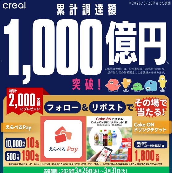 懸賞情報その場で当たる2,000名様にその場でえらべるPayやCoke ONドリンクチケットが当たるキャンペーン 懸賞名:累計調達額 1,000億円突破記念当選賞品&当選人数:えらべるPay 最大10,000円分(200名様)Coke ONドリンクチケット(1,800名様)応募条件:X(Twitter)アカウントでその場で当たる企業名:CREAL この懸賞に応募する2026年03月31日(残り4日) 見逃せない懸賞スキンケアアイテム商品モニター1,000名様サントリー DHA&EPA+セサミンEX1万名様子どもにピッタリの教材が見つかる!幼児向け教材をまとめました♪デジタルギフト 500円相当 / 特製鍋焼うどん / 鍋島焼のプレミアムどんぶり10,000名様 / 2,000名様 / 300名様えらべるPay 最大10,000円分 / Coke ONドリンクチケット200名様 / 1,800名様Amazonギフト券 10,000円分 / ジェラートピケ ママバッグ3名様 / 1名様 応募可能な懸賞関連する当選報告 毎月開催!明治ポイントが当たる大量当選レシート懸賞2026年05月07日(全3回開催)葉酸800μg配合のエレビット無料サンプルがもらえるキャンペーン☆なくなり次第終了アニメ「DARK MOON -黒の月:月の祭壇-」のQUOカードが当たるJOYSOUNDの歌唱キャンペーン残り4日最大1万円相当のガシャポンオンラインショップで使えるクーポンが当たるLINE懸賞締切日不明深澤辰哉・渡辺翔太のオリジナルクリアファイルやオリジナル鍋が当たるキャンペーン2026年03月31日(全2回開催)毎月開催!キョロちゃんグッズや森永商品が当たる感想投稿キャンペーン残り4日 エスビー食品のキャンペーンで「京橋千疋屋 季節の果物詰め合わせ」が当選しました♪アイフルホーム「エアロスフィアファン」が当選しました♪Movie Plusのキャンペーンで「フィフス・ウェイブ ムビチケ」が当選しました!P&Gのハガキ懸賞で「P&G商品ギフトセット」が当選しました♪ひかりTVのキャンペーンで「スイーツカタログギフト」が当選しました!サントリーのキャンペーンで「現金1万円」が当選しました☆ 関連情報: X懸賞(Twitter懸賞)オープン懸賞その場で当たるネット懸賞豪華・高額懸賞現金・金券・ギフト券大量当選無料クーポン・引換券SNS懸賞懸賞情報 高額賞品・高級品電子マネー・ポイントCokeONクーポン・無料券 HOME懸賞情報応募方法SNS懸賞X懸賞(Twitter懸賞)2,000名様にその場でえらべるPayやCoke ONドリンクチケットが当たるキャンペーン 2026年03月27日 更新:ものりんず@懸賞主婦【厳選】毎日応募 【全て】毎日応募