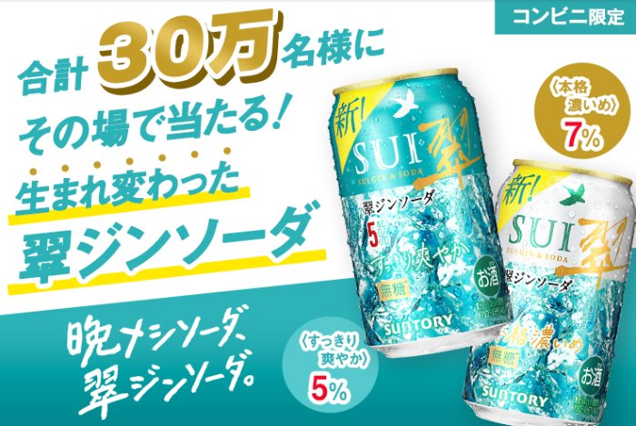 懸賞情報その場で当たる翠ジンソーダのコンビニ引換クーポンが当たる大量当選LINE懸賞 懸賞名:生まれ変わった翠ジンソーダがその場で当たる!キャンペーン当選賞品:翠ジンソーダ コンビニ引換クーポン当選人数:30万名様応募条件:LINEアカウントで応募企業名:サントリー この懸賞に応募する2026年04月13日(残り12日) 見逃せない懸賞カゴメトマトの苗7,000名様パンどろぼうグッズ3,000名様オリジナル名入れ絵本ダウンロードデータ対象者全員えらべるPay 最大1万円分 or アクリルブロック1,000名様ディズニーシー貸切パーティー招待券4,000組8,000名様ロボット掃除機 / ミラーレス一眼カメラ / ホームベーカリー / リフトロジー 他5名様 / 5名様 / 15名様 / 15名様 他 応募可能な懸賞関連する当選報告 サンリオの幼児向け英語教材がお試しできる無料モニターキャンペーン常時募集中全プレもアリ!BAKUNE MeshやBAKUNE Aroma Mistが当たる花王のクローズド懸賞残り12日毎月開催☆オリジナルグッズや生活雑貨が当たる会員限定キャンペーン毎月末日【東武ストア×ニッポンハムグループ】キッザニア東京チケットや商品券が当たる豪華懸賞残り6日Biore UV×StrayKidsコラボの限定グッズが当たるレシートキャンペーン残り36日【開催企業×キッコーマン】パークチケット+レストラン招待券も当たる豪華懸賞開催企業によって異なります 伊藤園「NEW TEAs’TEA 第二弾先行体験セット」が当選しました♪イトーヨーカドー×西川のハガキ懸賞で「TBC セルボディシェイプ」が当選しました♪S&Bのキャンペーンで「ハローキティのキッチンマット」が当選しました☆「ディズニーリゾート パークチケット」がイトーヨーカドーのクローズド懸賞で当選しました!コカ・コーラのキャンペーンで「9種から選べるスタミナ料理」が当選しました!乙川畜産食品のTwitter懸賞で「黒毛和牛サーロインステーキ」が当選しました☆ 関連情報: オープン懸賞LINE懸賞毎日応募その場で当たるネット懸賞大量当選無料クーポン・引換券SNS懸賞狙い目・穴場懸賞懸賞情報 お酒クーポン・無料券サントリー HOME懸賞情報応募方法SNS懸賞LINE懸賞翠ジンソーダのコンビニ引換クーポンが当たる大量当選LINE懸賞 2026年04月01日 更新:ものりんず@懸賞主婦【厳選】毎日応募 【全て】毎日応募