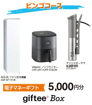 懸賞情報キッチン家電や電子マネーなどが当たるビンゴキャンペーン 懸賞名:【ビンゴコース】春の冷凍食品祭り当選賞品&当選人数:A賞:AQUA ファン式冷凍庫(10名様)B賞:ノンフライヤー(20名様)C賞:低温調理器(20名様)などなど賞品多数!応募条件:クイズに答えて応募企業名:トモシアホールディングス この懸賞に応募する2026年05月31日(残り60日) 見逃せない懸賞えらべるPay 500ポイント1万名様カレ・ド・ショコラ <スペリオリテ>毎月900名様ベビーカー / 抱っこ紐 / ベビーベッド / Amazonギフト 10,000円分 他1名様 / 1名様 / 1名様 / 3名様 他明治ポイント 200pt各月2,000名様Freciousお試しパック20,000名様ベルメゾンのおすすめ商品(毎週変動)賞品によって異なります 応募可能な懸賞関連する当選報告 サボンドサボタのマエガミキーパーがその場で当たるXキャンペーン残り24日京都 たち吉謹製 京皿セットが当たるサントリーのクローズドキャンペーン残り39日【イトーヨーカドー】全プレ!商品券 or nanacoが必ずもらえるキャンペーン残り1日図書カードが当たる「健康」をテーマにした川柳募集キャンペーン2026年06月10(全3回開催)毎月開催♪今月のオススメ商品セットが当たるキャンペーン!毎月開催50名様に選べるe-GIFT500円分が当たるXキャンペーン残り19日 「ハーゲンダッツアイスクリーム ミニカップ2枚セット」おやつカンパニーのキャンペーンで「お菓子詰め合わせ」が当選しました♪Yストア・伊藤ハムのハガキ懸賞で「グランドゴールド」の無料引換券が当選しました♪ヤクルトのハガキ懸賞で「ラグナシア ペアパスポート」が当選しました!Suntory「ボス レインボーマウンテンブレンド セット」が当選しました!サントリーのハガキ懸賞で「チョコレートファウンテン」が当選しました! 関連情報: オープン懸賞ネット懸賞家電・デジタル機器豪華・高額懸賞現金・金券・ギフト券懸賞情報生活用品・雑貨・家具 キッチングッズ|調理器具高額賞品・高級品AQUA電子マネー・ポイント生活家電調理家電冷蔵庫・冷凍庫 HOME懸賞情報応募方法ネット懸賞キッチン家電や電子マネーなどが当たるビンゴキャンペーン 2026年04月01日 更新:ものりんず@懸賞主婦【厳選】毎日応募 【全て】毎日応募
