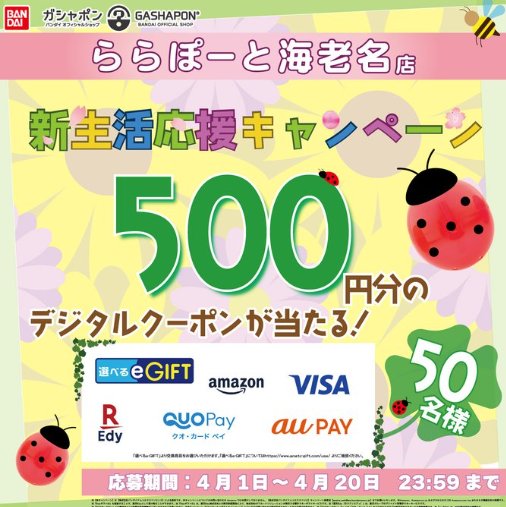 懸賞情報その場で当たる選べるe-GIFT500円分が50名様にその場で当たる毎日応募Xキャンペーン 懸賞名:新生活応援キャンペーン当選賞品:選べるe-GIFT 500円分当選人数:50名様応募条件:X(Twitter)アカウントで毎日その場で当たる企業名:ガシャポンのデパートららぽーと海老名店 この懸賞に応募する2026年04月20日(残り19日) 見逃せない懸賞JTBトラベルギフト 5万円分 / ハンディクリーナー / カタログギフト 他各回5名様 / 各回20名様 / 各回30名様 他えらべるPay 最大1万円分1,000名様しまじろうグッズ / JCBギフトカード 1,000円分合計200名様 / 400名様えらべるPay 100ポイント / ブラックサンダー詰め合わせ5,000名様 / 100名様8×4デオドラントパテ無料サンプル対象者全員JTBトラベルギフト 35,000円分毎月35名様 応募可能な懸賞関連する当選報告 8x4MENデオドラントパテが無料サンプルでお試しできるキャンペーン残り274日京都 たち吉謹製 京皿セットが当たるサントリーのクローズドキャンペーン残り39日1,000名様にPayPayポイントが当たる日本食研のクローズドキャンペーンキャンペーン告知商品がなくなり次第終了全プレ☆素敵な商品と交換できるポイントキャンペーン!残り90日2,000名様に午後の紅茶新商品を含むセットが当たるクローズドキャンペーン残り16日400名様にキャラねる袋が当たる光るパジャマ購入キャンペーン2026年06月30日(全4回抽選) マックスバリュ×ヤマザキビスケットのハガキ懸賞で「商品券 2,000円分」が当選しました☆街コンジャパン「Facebook・Twitterキャンペーン」エスビー食品「ゴールデンカレー黄金の香り実感! 食べ比べセット」が当選しました♪BOAT RACE LOUNGEのキャンペーンで「QUOカード 5,000円分」が当選しました!オタフク『わが家の食卓が変わる。健康和食生活キャンペーン』S&Bのキャンペーンで「ハローキティのキッチンマット」が当選しました☆ 関連情報: X懸賞(Twitter懸賞)オープン懸賞毎日応募ネット懸賞その場で当たる現金・金券・ギフト券SNS懸賞懸賞情報 ギフトコード|デジタルギフトバンダイ HOME懸賞情報応募方法SNS懸賞X懸賞(Twitter懸賞)選べるe-GIFT500円分が50名様にその場で当たる毎日応募Xキャンペーン 2026年04月01日 更新:ものりんず@懸賞主婦【厳選】毎日応募 【全て】毎日応募