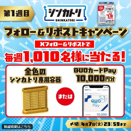 懸賞情報その場で当たる金色のシンカトリ専用容器やQUOカードPay1万円分が当たるキャンペーン 懸賞名:フォロー&リポストキャンペーン当選賞品&当選人数:金色のシンカトリ専用容器(各週1,000名様)QUOカードPay 1万円分(各週10名様)応募条件:X(Twitter)アカウントでその場で当たる企業名:KINCHO この懸賞に応募する2026年05月05日(全5回開催) 見逃せない懸賞午後の紅茶セット2,000名様ヘナカラートリートメント無料サンプル応募者全員サンリオの幼児向け英語教材がお試しできる無料モニターキャンペーンサントリー天然水 1ケース5,000名様えらべるPay 100ポイント / ブラックサンダー詰め合わせ5,000名様 / 100名様子どもにピッタリの教材が見つかる!幼児向け教材をまとめました♪ 応募可能な懸賞関連する当選報告 5,000円相当のマルタイ商品詰め合わせが1,000名様に当たるキャンペーン残り364日その場で抽選!星野リゾート宿泊ギフトやオリジナルグッズも当たるキャンペーン残り54日全プレもアリ!ベビーグッズやマタニティ用品が当たるママ・プレママさん向け懸賞☆毎月末日【東武ストア×ニッポンハムグループ】キッザニア東京チケットや商品券が当たる豪華懸賞残り6日無料で「Disneyのおしりふき」が当たる会員限定プレゼントキャンペーン!毎月抽選最大10万名様にプレミアムポイントがその場で当たるバンダイのキャンペーン締切日不明 SUNSTAR「糖尿病とうまくつきあうサイト オーラルケアに関するアンケートの謝礼」カバヤ食品×ナフコのハガキ懸賞で「とちおとめ苺」が当選しました☆ポッカサッポロのネットクローズド懸賞で「じっくりコトコトスペシャルBOX」が当選しました☆Valor・LOTTE共同企画「バロー商品券1,000円分」が当選しました♪KIRIN「いくぜ8月!!日がわり夏のキリン祭り」ママこえモニター「ウテナ シンプルバランス セット」が当選しました♪ 関連情報: X懸賞(Twitter懸賞)オープン懸賞ネット懸賞その場で当たる豪華・高額懸賞現金・金券・ギフト券大量当選SNS懸賞狙い目・穴場懸賞懸賞情報 高額賞品・高級品電子マネー・ポイントQUOカードPay HOME懸賞情報応募方法SNS懸賞X懸賞(Twitter懸賞)金色のシンカトリ専用容器やQUOカードPay1万円分が当たるキャンペーン 2026年04月01日 更新:ものりんず@懸賞主婦【厳選】毎日応募 【全て】毎日応募