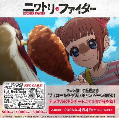 懸賞情報その場で当たる最大5,000円分のデジタルKFCカードがその場で当たるXキャンペーン 懸賞名:アニメ放送直前 プレゼントキャンペーン当選賞品:デジタルKFCカード 最大5,000円分当選人数:不明応募条件:X(Twitter)アカウントでその場で当たる企業名:ニワトリ・ファイター この懸賞に応募する2026年04月04日(残り3日) 見逃せない懸賞テンスター カラーシャンプー無料サンプル対象者全員デジタルポイント 最大10,000pt11,100名様妊婦さん必見!無料で試せる「紙おむつ・粉ミルク」のお得情報 BEST10♪QUOカード 1,000円分 / アスパラガスお菓子詰め合わせ / オリジナルボトル合計500名様 / 合計300名様 / 合計200名様デジタルギフト 500円相当 / 特製鍋焼うどん / 鍋島焼のプレミアムどんぶり10,000名様 / 2,000名様 / 300名様マタニティ・ベビー用品・コスメなどのサンプルセット賞品によって異なる 応募可能な懸賞関連する当選報告 毎月開催!カルビーのお菓子が当たるLINEプレゼントキャンペーン毎月開催Nintendo Switchやルンバロボット掃除機も当たる豪華クローズドキャンペーン残り14日【関西スーパー×ニッポンハム】キッザニア甲子園入場券プレゼントキャンペーン残り7日DEWのブライトバウンスミルクがサンプルでお試しできるキャンペーン残り14日5,000円分のAmazonギフトコードが当たる自転車購入キャンペーン残り60日【ジョイフル本田×P&G】Wチャンスもアリ!Visa eギフトが当たる豪華キャンペーン残り23日 DyDoのハガキ懸賞で「ル・クルーゼ ペア・ショート・タンブラー」が当選しました!Coca-Cola【発売前に緊急ミッション!『ジョージア ザ・プレミアム 微糖』が発売前に当たる!】キャンペーンキユーピー「マヨテラスキユーピー人形」が当選しました☆SHISEIDO「アクアレーベル体感モニター」に当選しました♪バロー×LOTTEのハガキ懸賞で「カタログギフト」が当選しました☆ユニ・チャームのキャンペーンで「ムーニーエアフィット 1パック」が当選しました! 関連情報: X懸賞(Twitter懸賞)オープン懸賞ネット懸賞その場で当たる現金・金券・ギフト券SNS懸賞懸賞情報 商品券・ギフト券・金券ケンタッキー|KFC HOME懸賞情報応募方法SNS懸賞X懸賞(Twitter懸賞)最大5,000円分のデジタルKFCカードがその場で当たるXキャンペーン 2026年04月01日 更新:ものりんず@懸賞主婦【厳選】毎日応募 【全て】毎日応募
