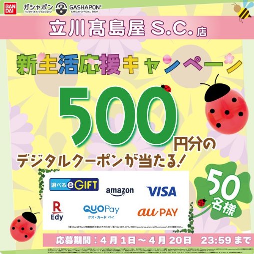 懸賞情報その場で当たる50名様に選べるe-GIFT500円分が当たるXキャンペーン 懸賞名:新生活応援キャンペーン当選賞品:選べるe-GIFT 500円分当選人数:50名様応募条件:X(Twitter)アカウントで毎日その場で当たる企業名:ガシャポンバンダイオフィシャルショップ立川髙島屋S.C.店 この懸賞に応募する2026年04月20日(残り19日) 見逃せない懸賞ナルミヤキャラクターズ限定グッズ1,100名様限定デザインQUOカードPay 3,000円分 / 限定デザインクリアポーチ毎月200名様 / 毎月300名様月刊ポピーの無料おためし見本応募者全員すこやかM1サンプル / 赤ちゃんに届くDHAサンプル毎月1,000名様 / 毎月500名様Yunth ❘ Vのオリジナルステッカー / Yunth豪華セット1,000名様 / 100名様オリジナルフレークシール~プレママver~応募者全員 応募可能な懸賞関連する当選報告 4,000円分のゆず庵アプリクーポンが当たる、ゆずフォト投稿キャンペーン残り12日NintendoSwitchや瞬足ロゴ入りアイテムも当たるクローズドキャンペーン残り28日8x4MENデオドラントパテが無料サンプルでお試しできるキャンペーン残り274日毎月抽選!リポビタンやQUOカードが当たるクローズドキャンペーン2026年03月31日(全7回開催)オージオの人気商品&サンプルが当たるクチコミ投稿キャンペーン!毎月開催ビーンスターク商品がお試しできるサンプルプレゼントキャンペーン毎月開催 サンプル百貨店のキャンペーンで「ELLE×ミウ スパークリング&強炭酸のまま飲める 炭酸割り専用りんご酢」が当選しました!「ディズニーリゾート パークチケット」がイトーヨーカドーのクローズド懸賞で当選しました!旅工房のTwitter懸賞で「LOTTEハロウィンパック」が当選しました☆SUNSTAR「糖尿病とうまくつきあうサイト オーラルケアに関するアンケートの謝礼」シンカシング「低反発クッション」が届きました!ヤクルトのハガキ懸賞で「ラグナシア ペアパスポート」が当選しました! 関連情報: X懸賞(Twitter懸賞)オープン懸賞毎日応募ネット懸賞その場で当たる現金・金券・ギフト券SNS懸賞懸賞情報 ギフトコード|デジタルギフトバンダイ HOME懸賞情報応募方法SNS懸賞X懸賞(Twitter懸賞)50名様に選べるe-GIFT500円分が当たるXキャンペーン 2026年04月01日 更新:ものりんず@懸賞主婦【厳選】毎日応募 【全て】毎日応募